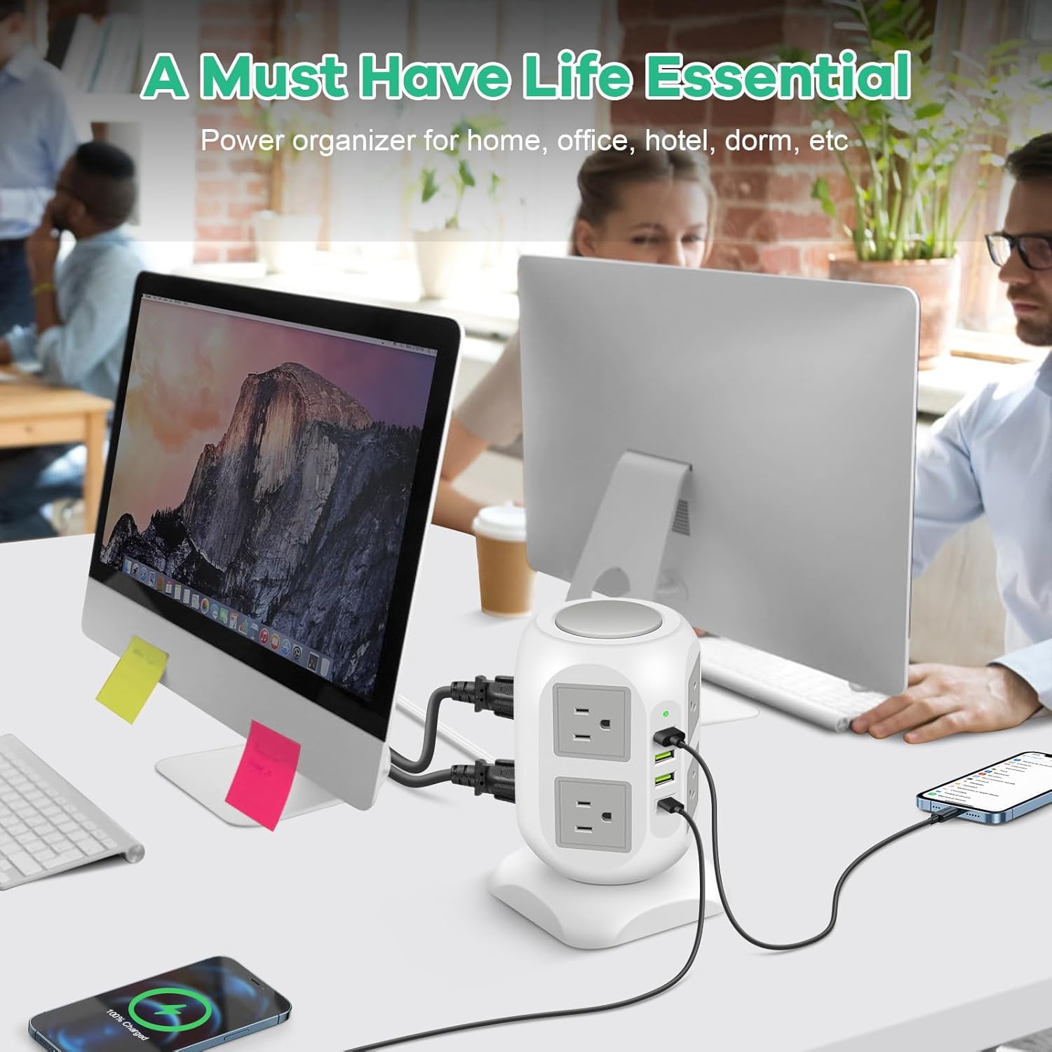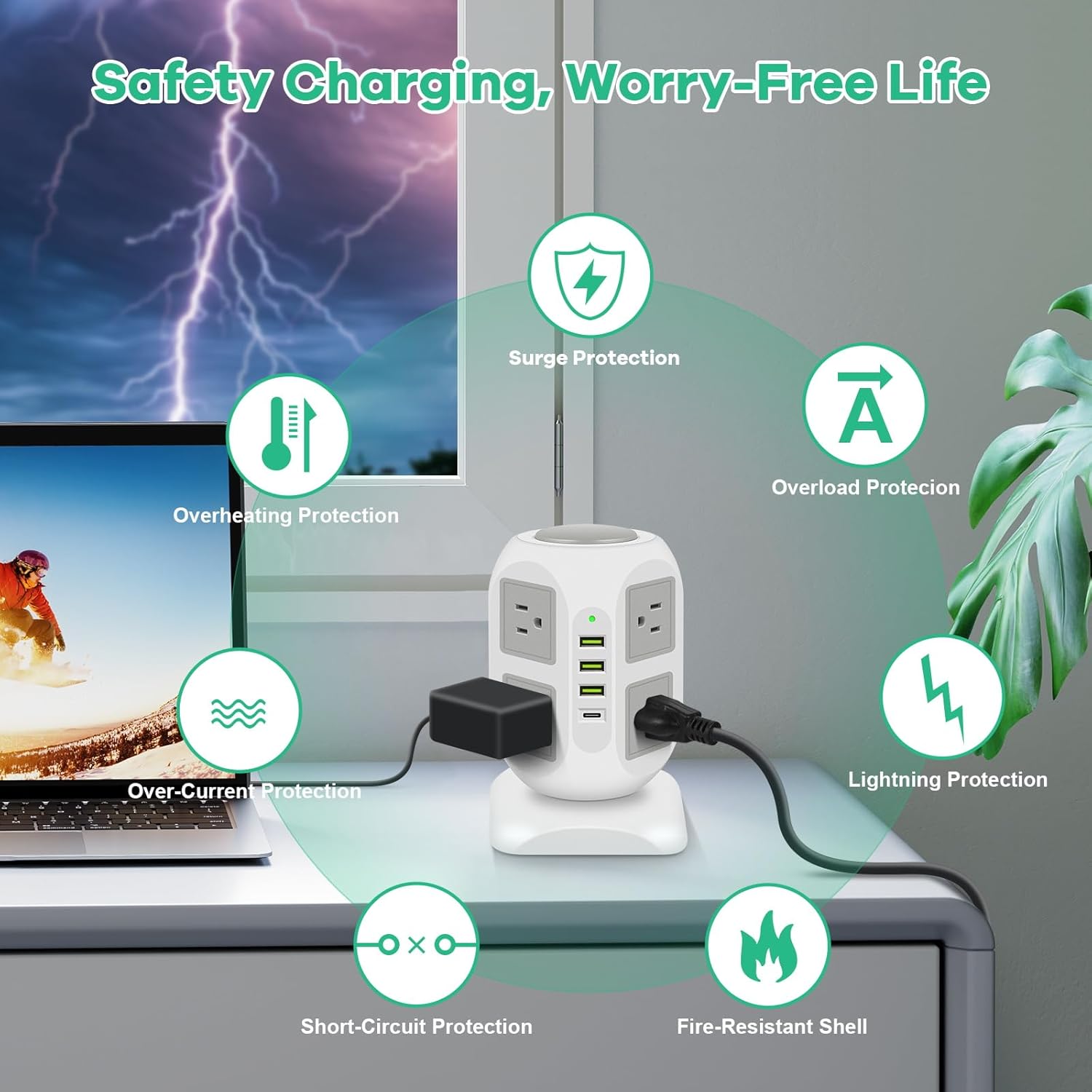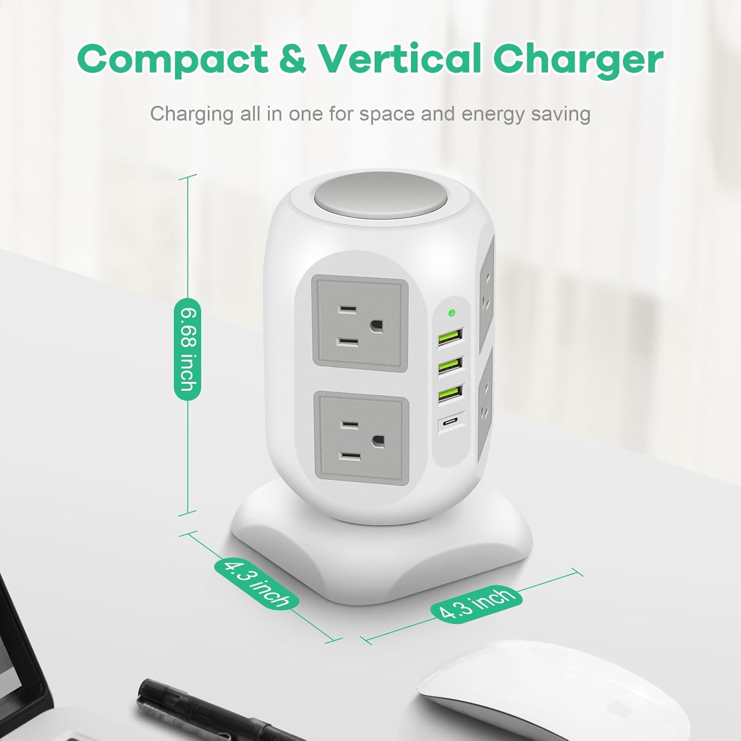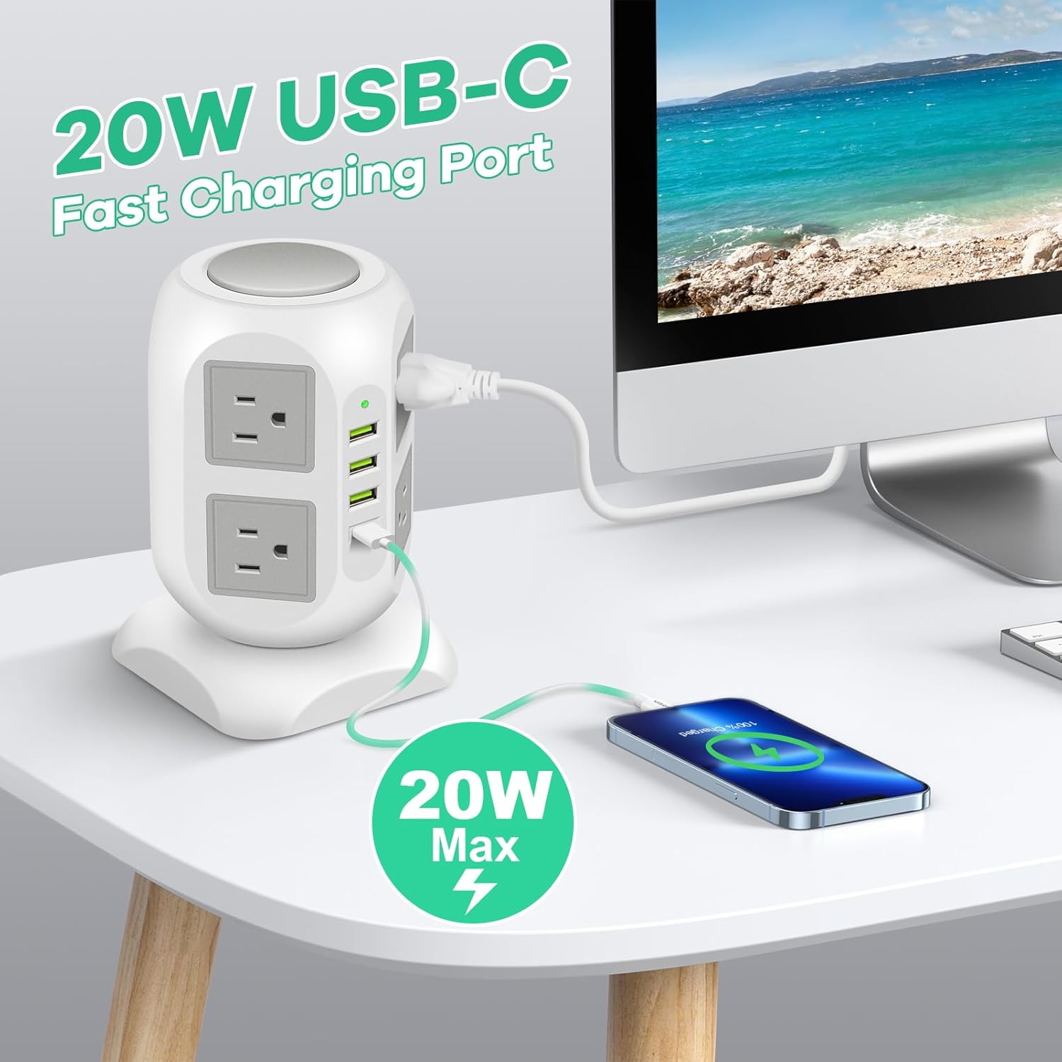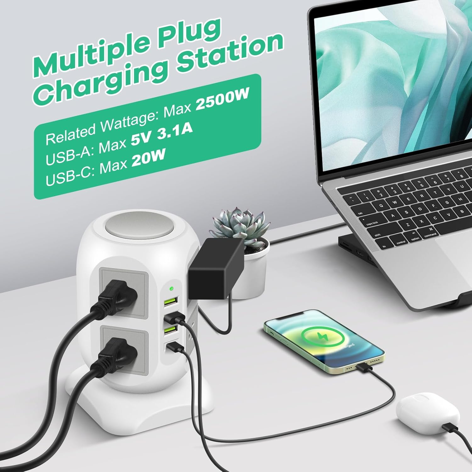Multiple Outlets 8 AC Outlets + 4 USB Ports Long Cord 15 FT, extra long for reaching anywhere you want AC Outlets 2500W, 10A, 110-250V Smart USB Charging 5V 3.1A Total, 3.1A/Port Max. 8 AC Outlet For computer, keyboard, mouse, monitor, TV, tablet, PC, laptop, printer, etc 3 USB-A Ports For Smartphones, Like iPhone, Samsung, LG, etc, Bluetooth Earpiece Like Airpods, Airpods Pro, etc Vertical Charging Tower Desk Organizer, Space Saver. A Must Have Electric Device for Home Office Dorm Room Hotel College Desk 20W Power Delivery USB-C Fast for iPhone and iPad