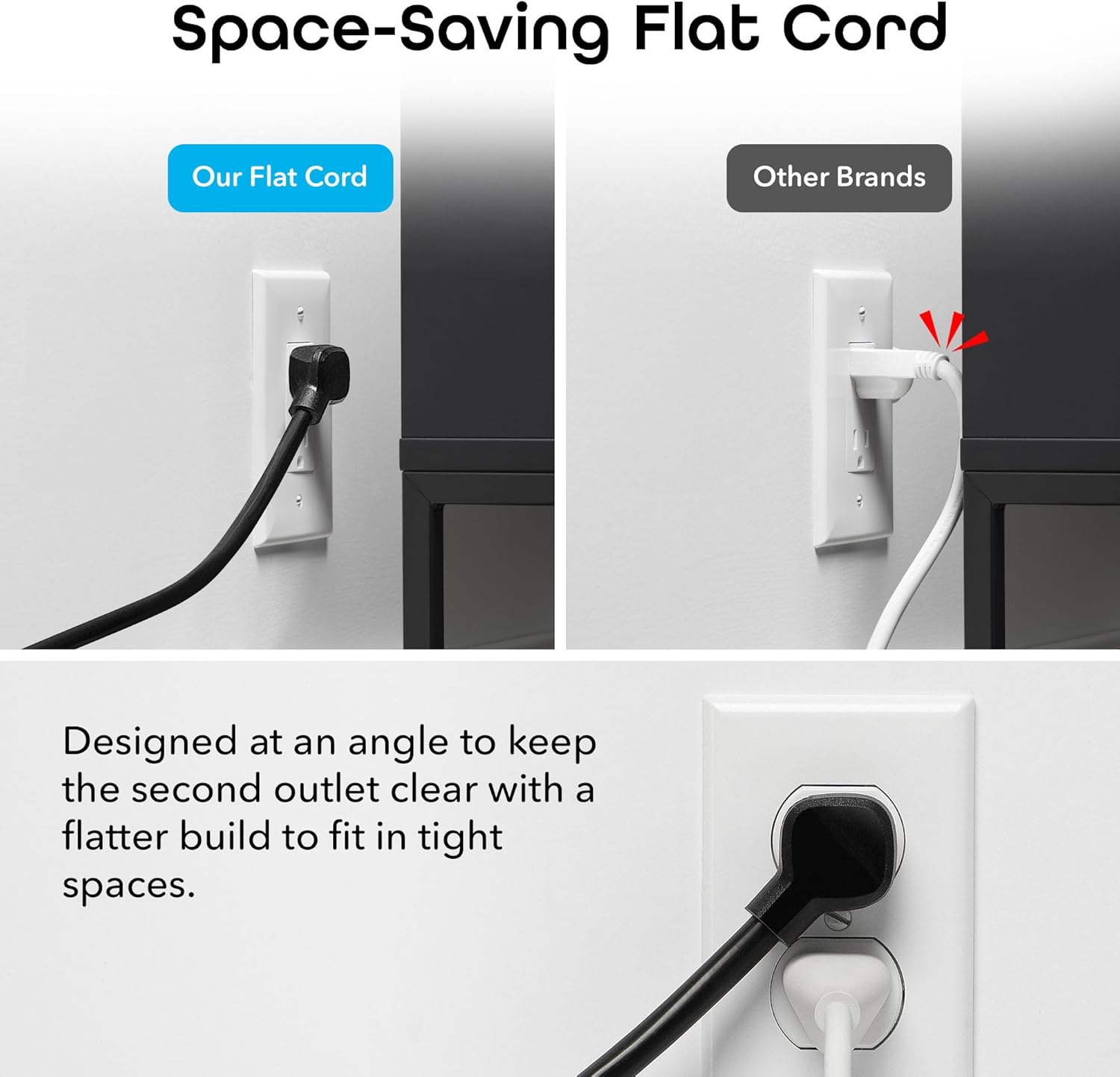 The outlets are spaced 2 inches apart side-by-side and 4 inches apart from the outlets across from them. This design accommodates larger or bulky plugs with ease.