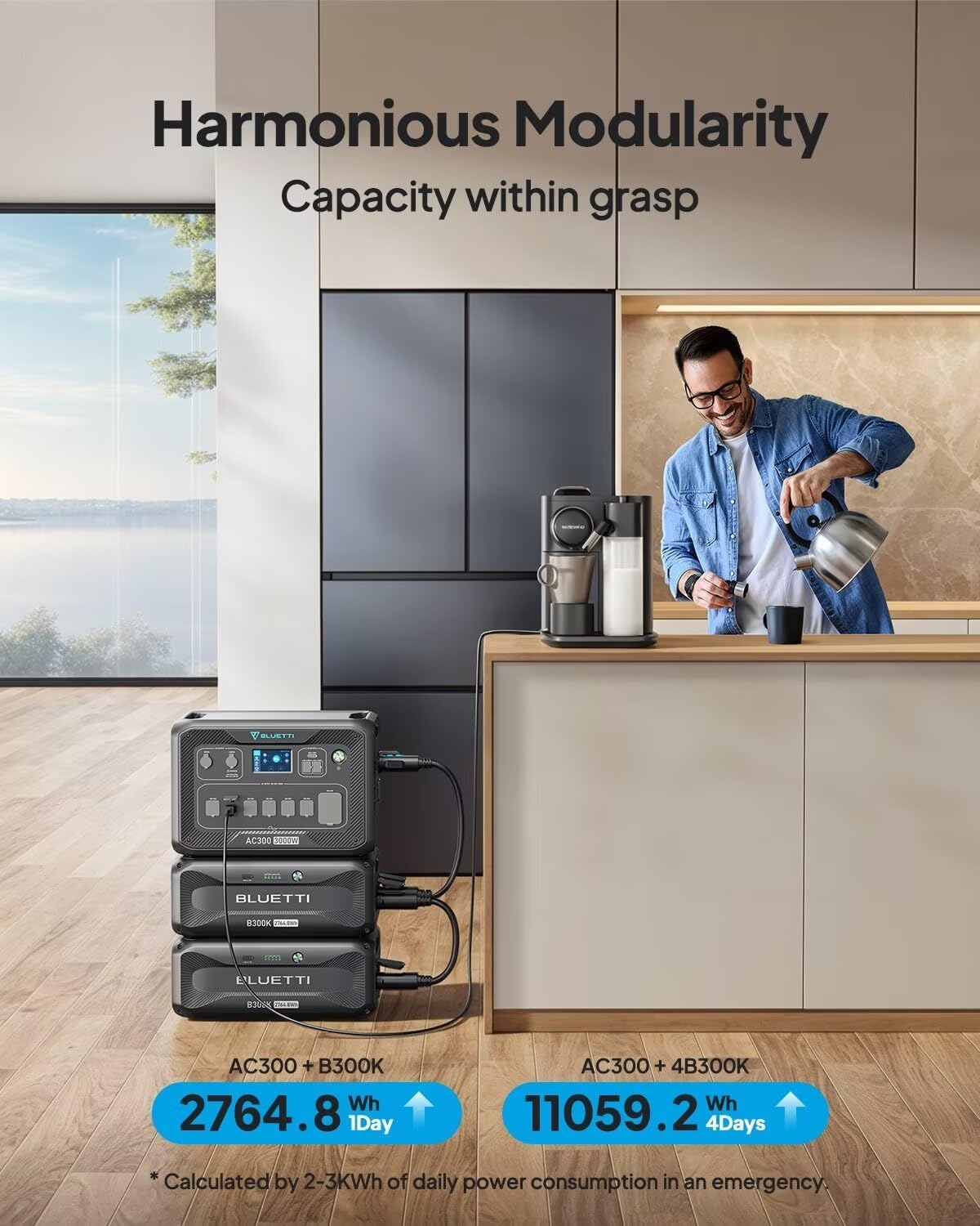 [Expandable Capacity] – AC300 supports up to 4 B300K battery packs (2764.8Wh each), allowing an impressive overall capacity of 11059.2Wh, ensuring uninterrupted power for your essentials during outages.