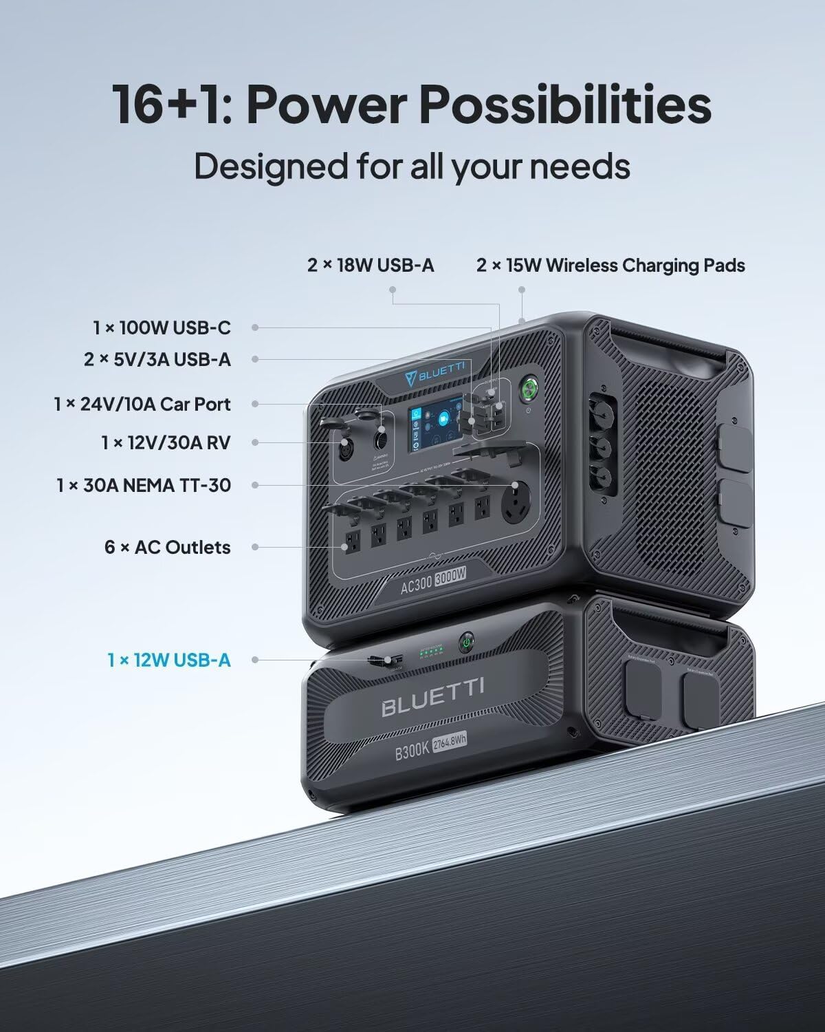 [What You Get] – BLUETTI AC300 & B300K(𝐬𝐑𝐒𝐩𝐩𝐞𝐝 𝐬𝐞𝐩𝐚𝐫𝐚𝐭𝐞π₯𝐲), 350W solar panel(𝐬𝐑𝐒𝐩𝐩𝐞𝐝 𝐬𝐞𝐩𝐚𝐫𝐚𝐭𝐞π₯𝐲), 15A AC charging cable, DC charging cable, car charging cable, user manual.