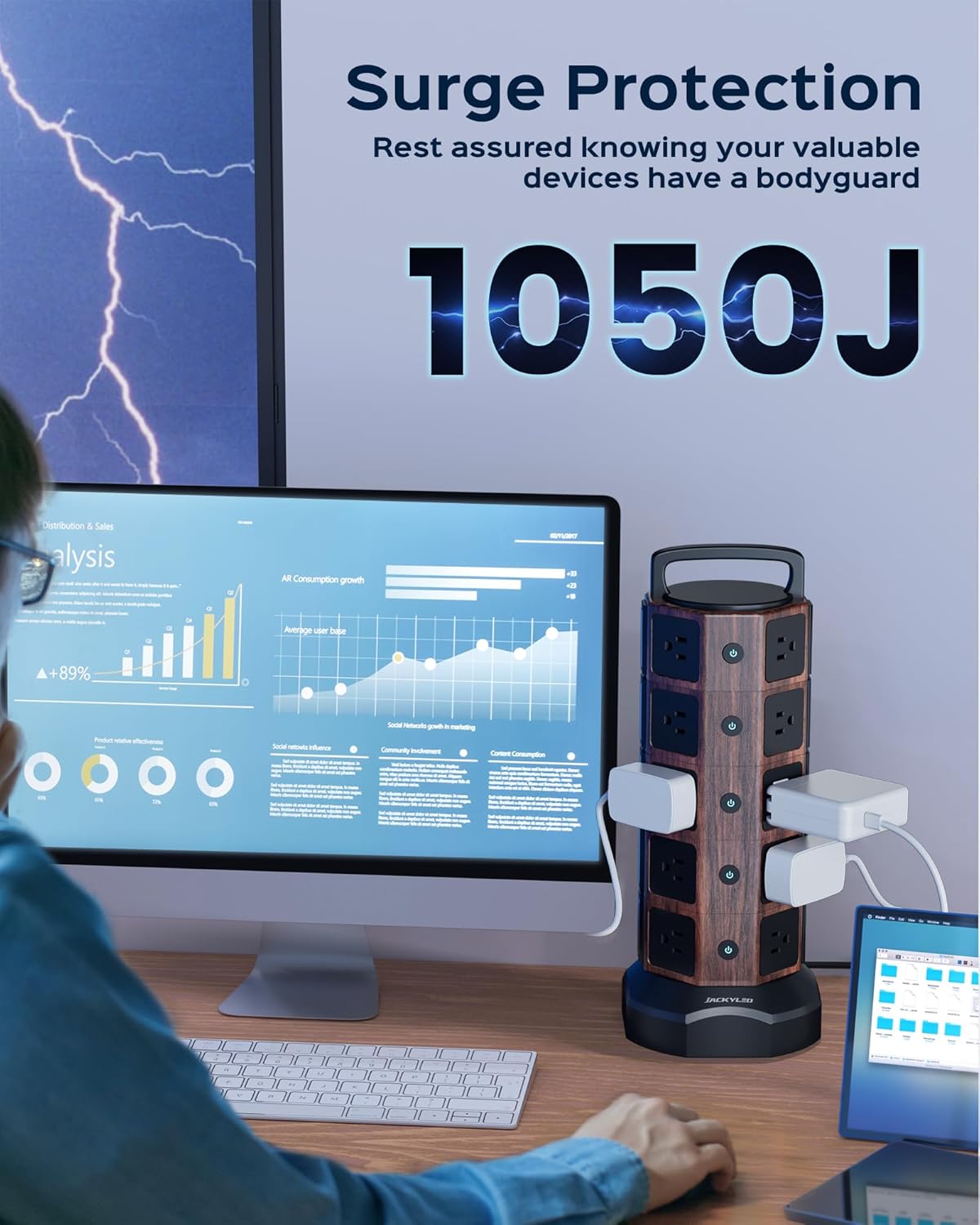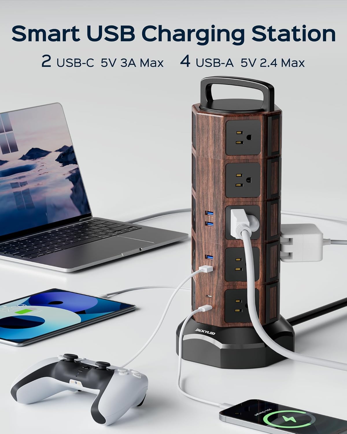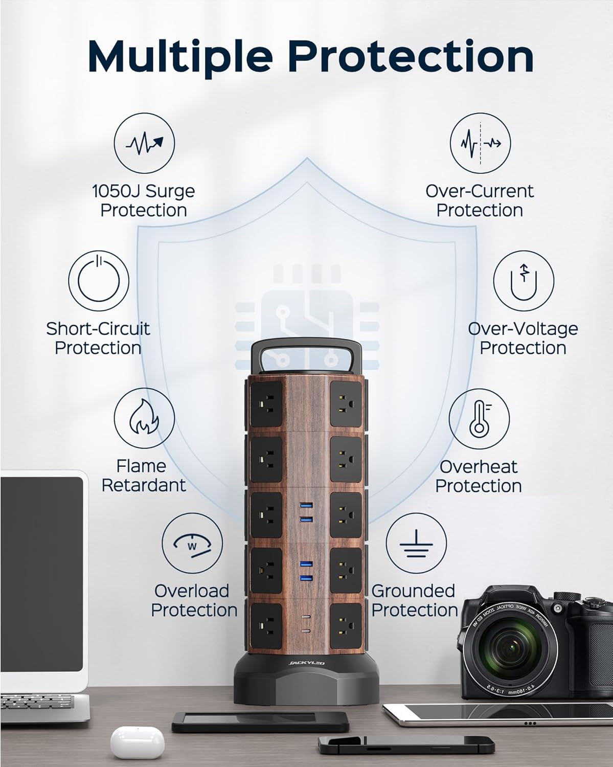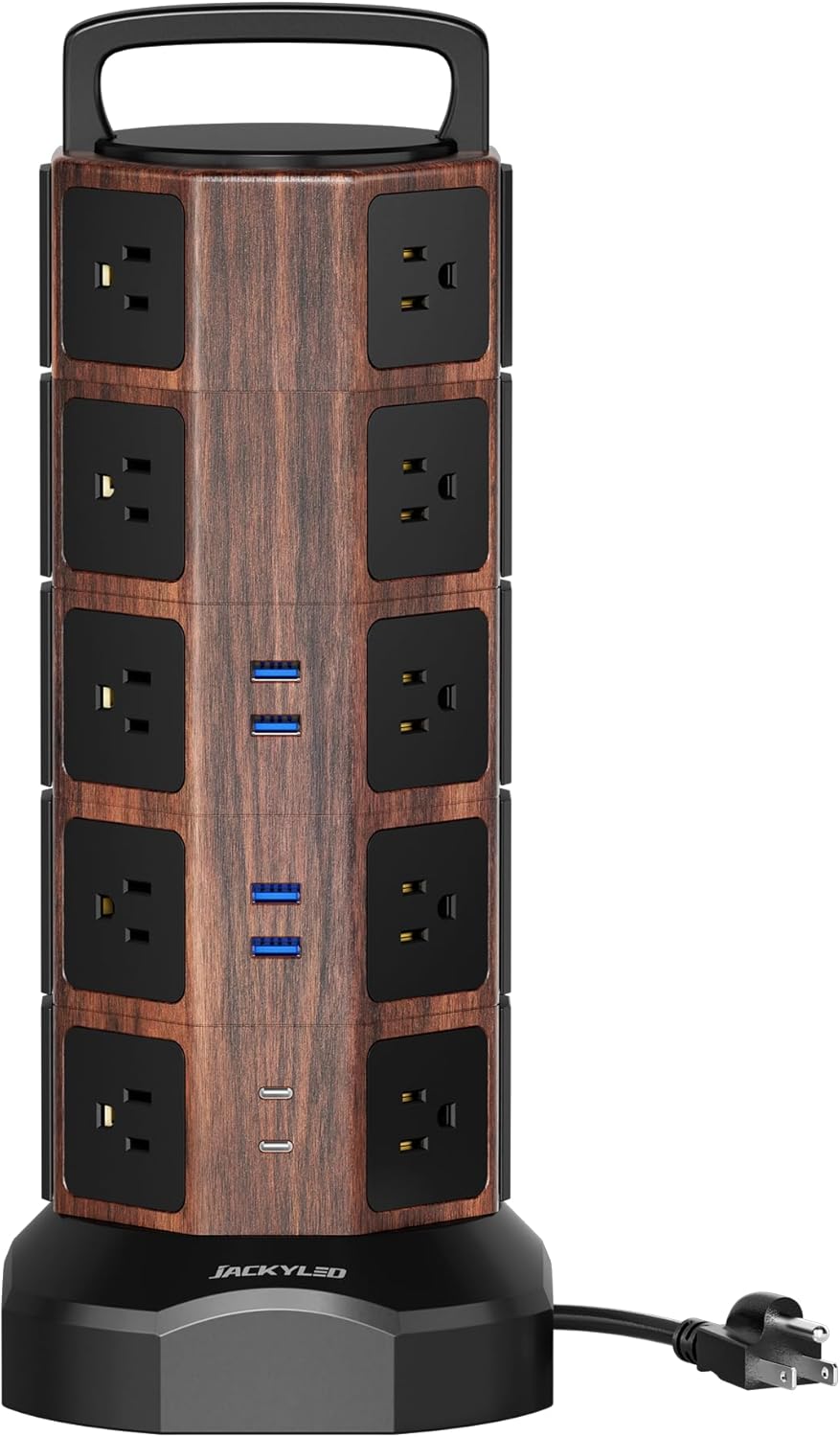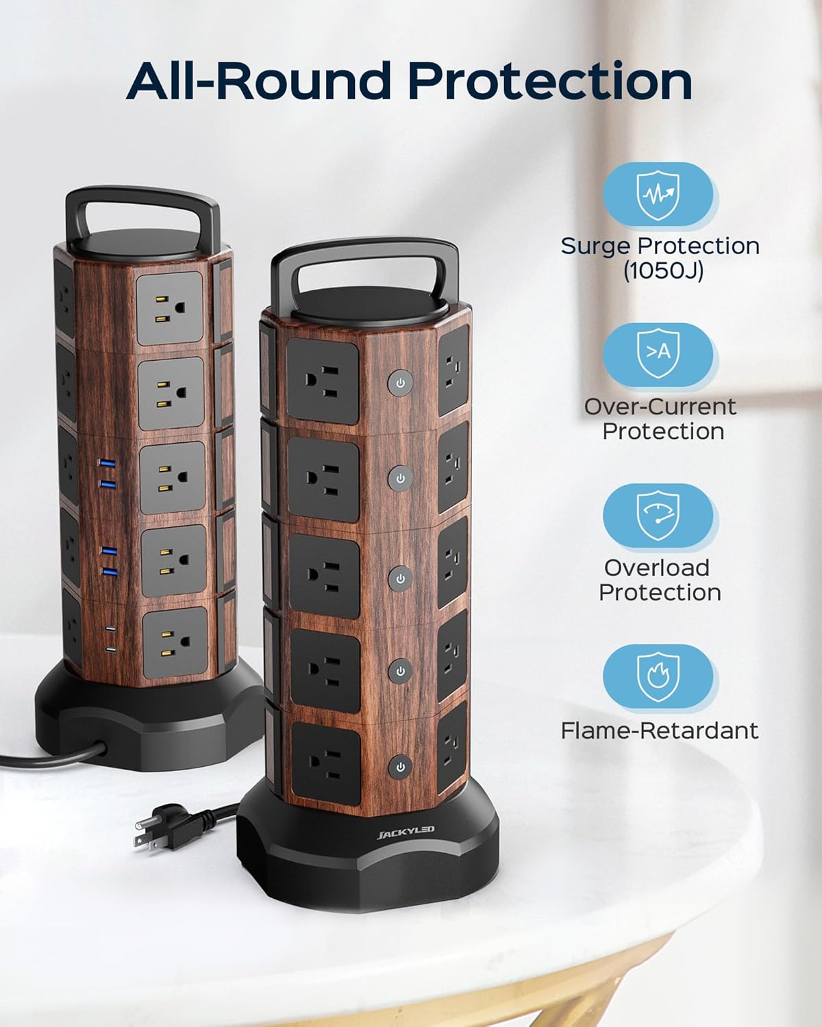 JACKYLED surge protector tower has a vertical design, small footprint but versatile. With the 20 wide-spaced outlets, you don’t need to worry about big plugs blocking the adjacent outlets.