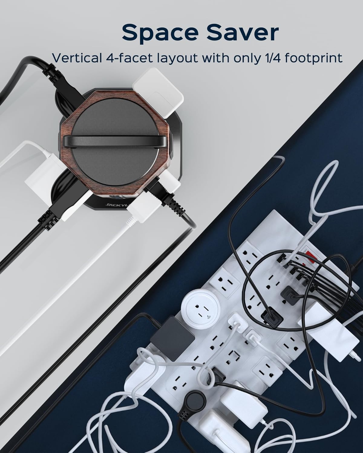 A3: With the vertical design, this compact surge protector tower can fit in limited spaces and has a small footprint(ONLY 5.67*5.67 inches). It takes up less room than a power strip and has more outlets.
