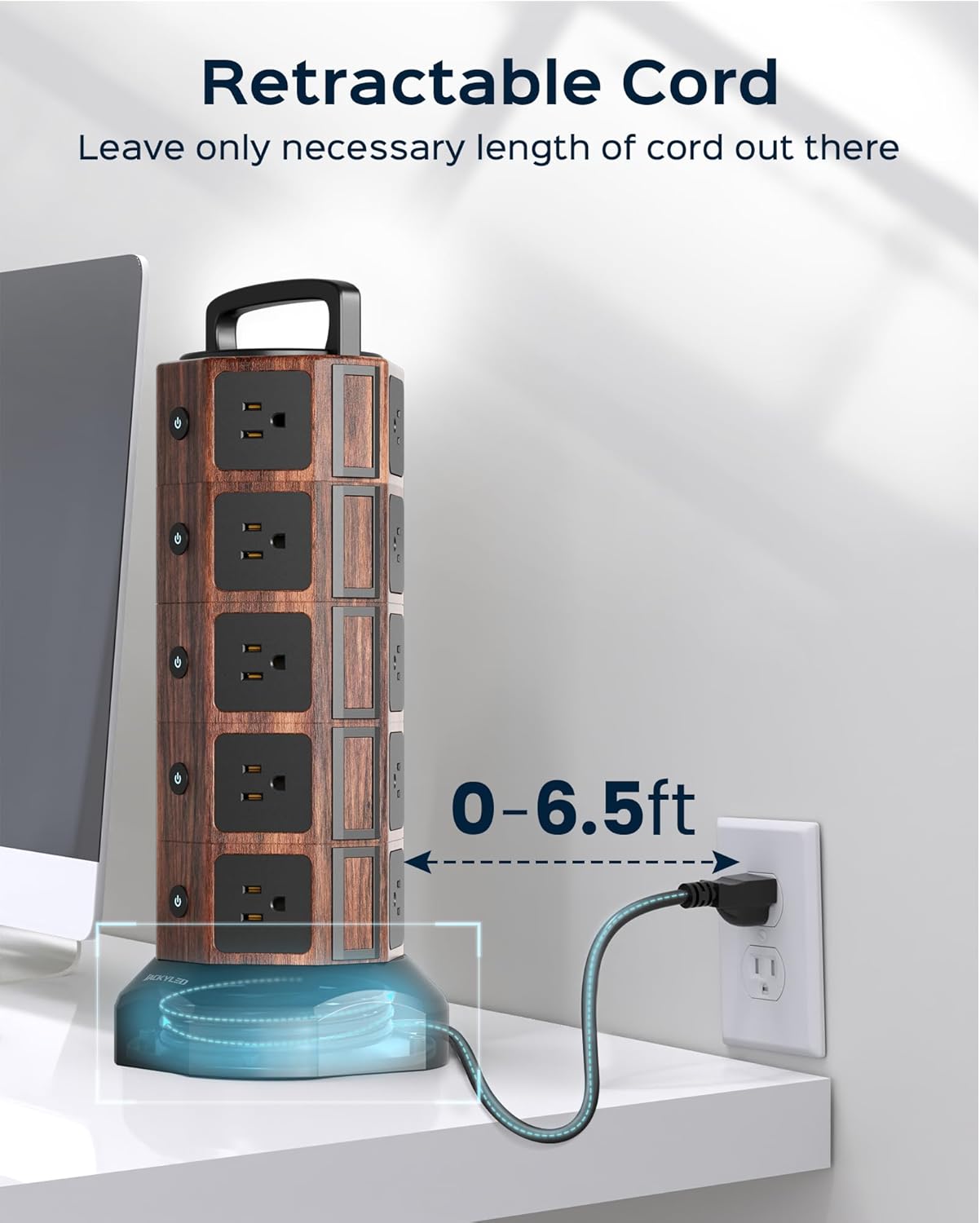 【Retractable Cord】 The 6.5 feet heavy duty power cord of this power tower can be retracted by rotating the tower and get rid of excess cord length, designed for the convenience of your use.