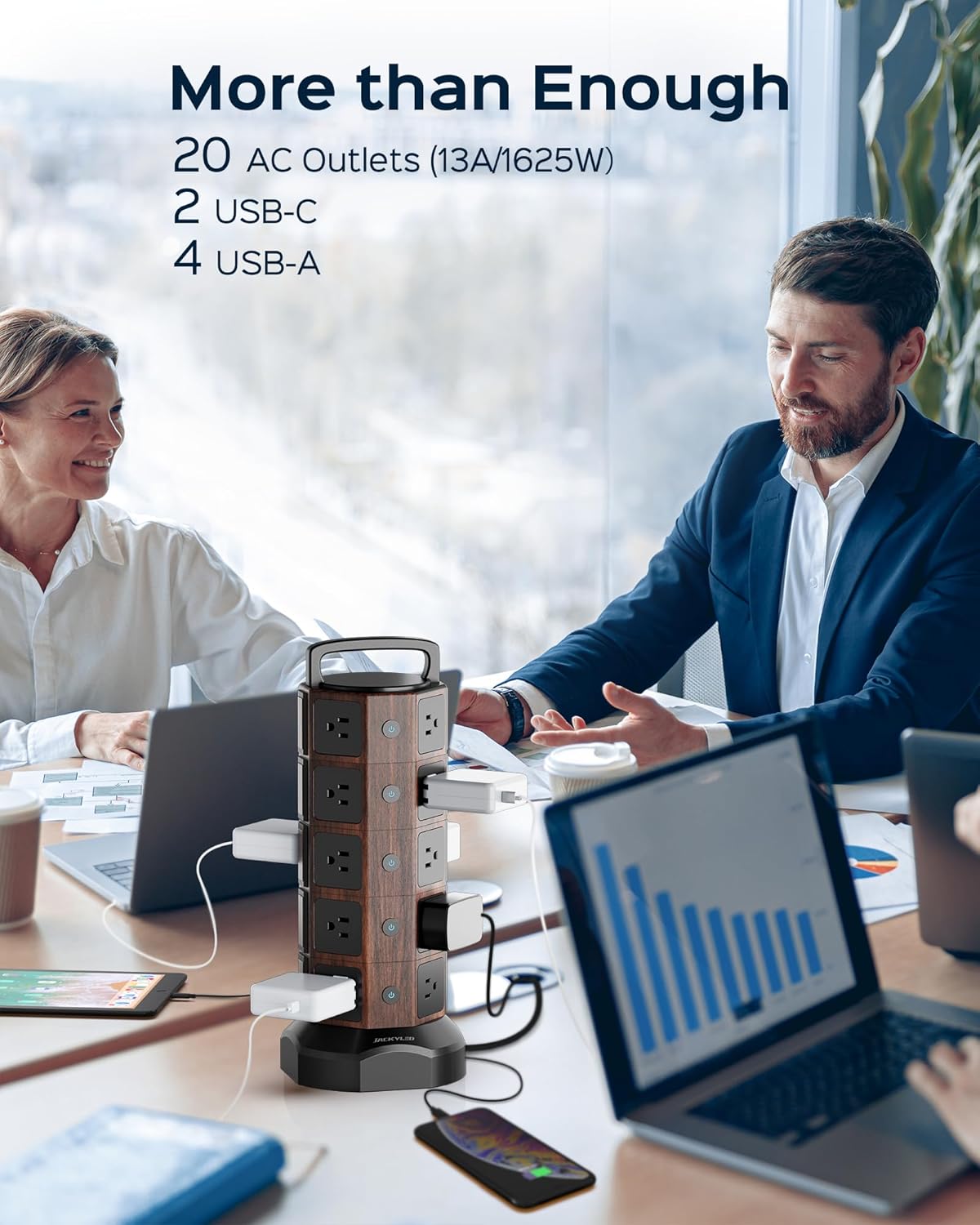 6. Humanized Design: Owing to its vertical tower design, it won’t collect dust like a floor multiplug and only takes a small footprint to fit in limited spaces.