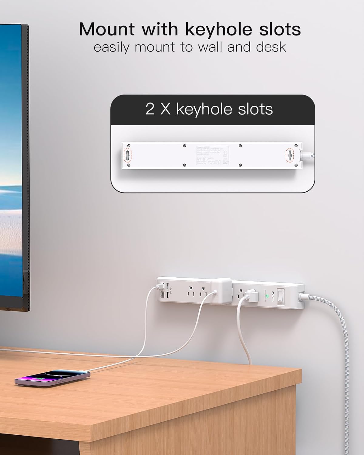【Wall Mount & Slim Design】- This mountable power strip can be fixed on the wall or desk by 2 keyhole slots on the back. The slim design could be hidden in the corner or the edge of table for a tidy look at home or in the dorm.