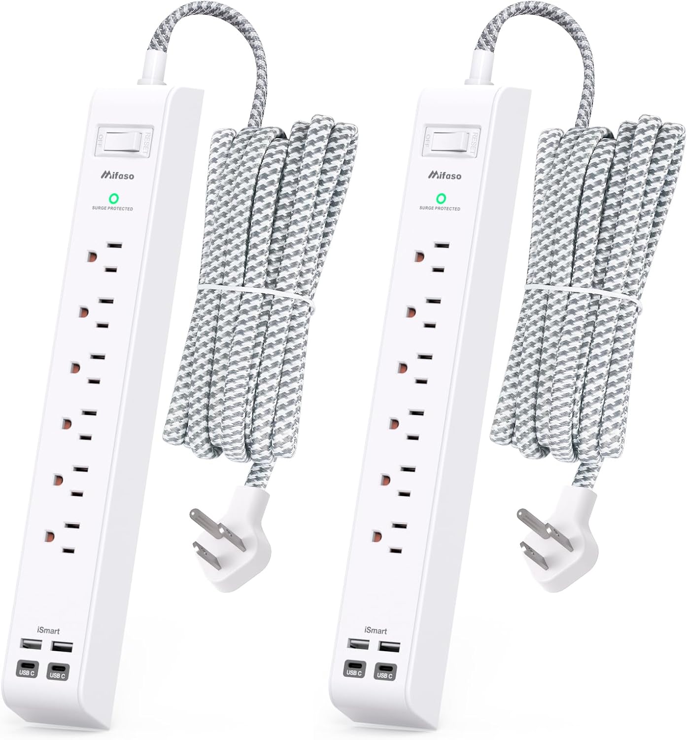 Ultra Flat Plug & 5FT Braided Extension Cord1080J Surge ProtectionON/OFF Switch Overload ProtectionSlim, Sleek and Compact Design