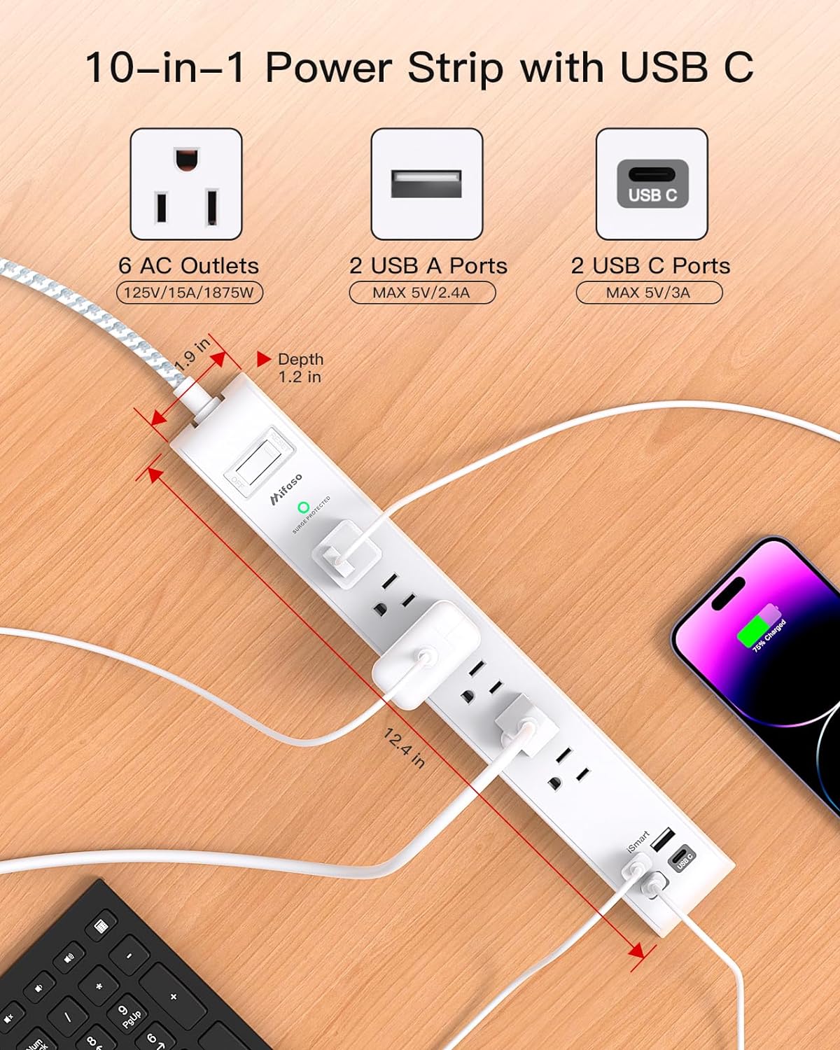 Power Rating: 1875W, 125V, 15A, 60Hz Plug Type: 0.35″ Ultra Thin Flat Plug with 45° Angled AC Outelts 6 *2 Outlets Length of Cable: 10Ft/ 3M Item Dimensions: 12.4*4.9*1.6 inch Surge Protection: 1080 Joules USB C Output: Max 5V/3A, 15W USB A Output: Max 5V/2.4A, 12W USB Output: 5V/3.1A/15.5W Total Weight: 1.85 lb