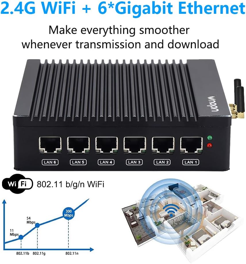 【6x Intel 2.5Gigabit Ethernet Ports】 This fanless mini computer all use Intel i226 network card chips, supports 6x 2.5gigabit ethernet to keep stable and high speed. It has a good compatibility for soft routing, firewall and other network applications. This compact PC has more I/O Interfaces to meet your more needs: 1x HD, 1x VGA, 4x RJ45 LAN, 2x USB3.0, 1x DC IN. Our quad port mini PC fanless can be as a home router, nas, server, mini computer ect