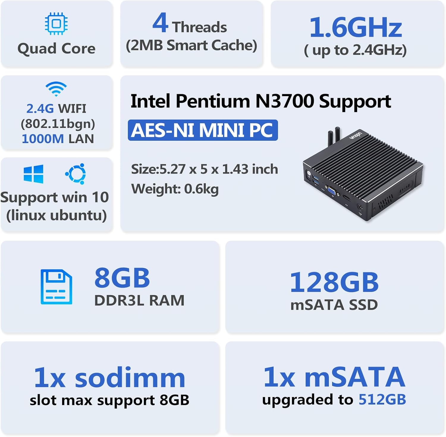 【High Capacity Storage】This little firewall box comes with 8GB DDR3L RAM and 128GB mSATA SSD. The memory is only 1x sodimm slot, max support 8GB. The storage is 1x mSATA, can be upgraded to 512GB. Large storage can meet the hardware requirements of different network security firewall software and hypervisor applications.
