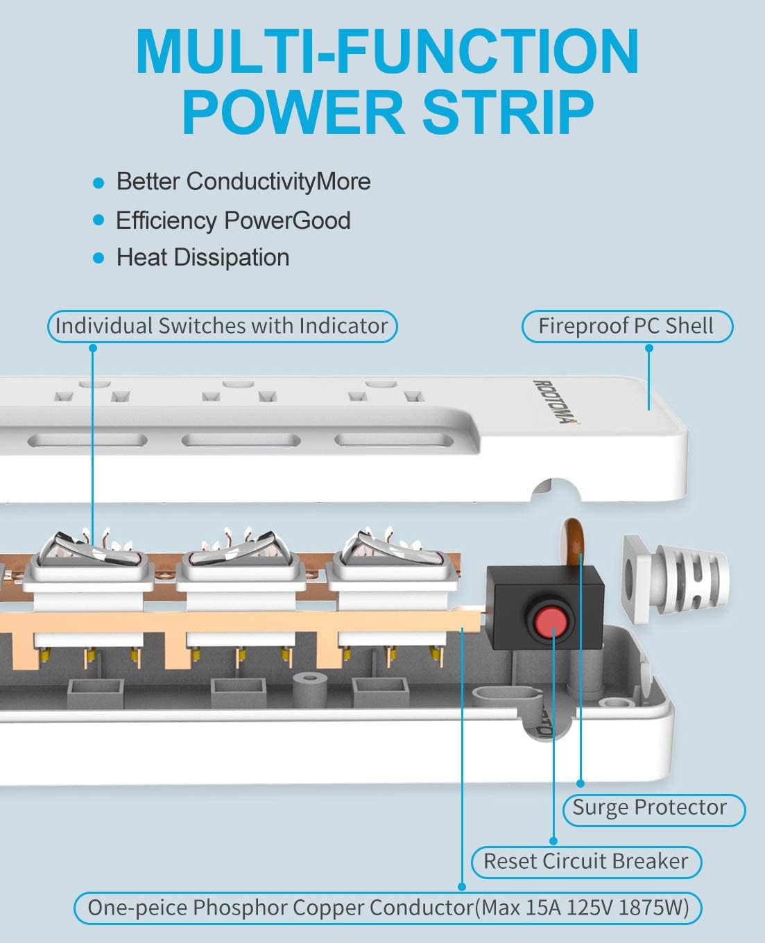 【Multi-Protection】This multi outlet Power Strip has advanced Surge Protection, Circuit Breaker, Overload protection and Fireproof function that will automatically cut power to protect connected devices when voltage surge or over-current is detected. Provide safety for your Family and your Appliances.