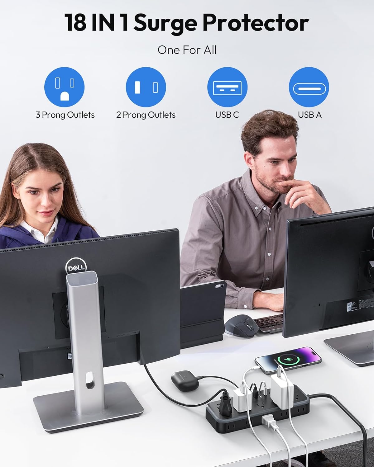 【2 USB-C and 2 USB-A Ports】Are you worried about not having enough adapters when charging multiple electronic devices? This Power Strips with Surge Protection comes with 2 USB-C ports and 2 USB-A ports, so you can charge multiple devices at the same time without any adapters. Built-in smart charging technology enables USB to intelligently detect your electronic devices and charge them at the optimal and safe speed (USB-C: 5V⎓3.1A, USB-A: 5V⎓2.4A)