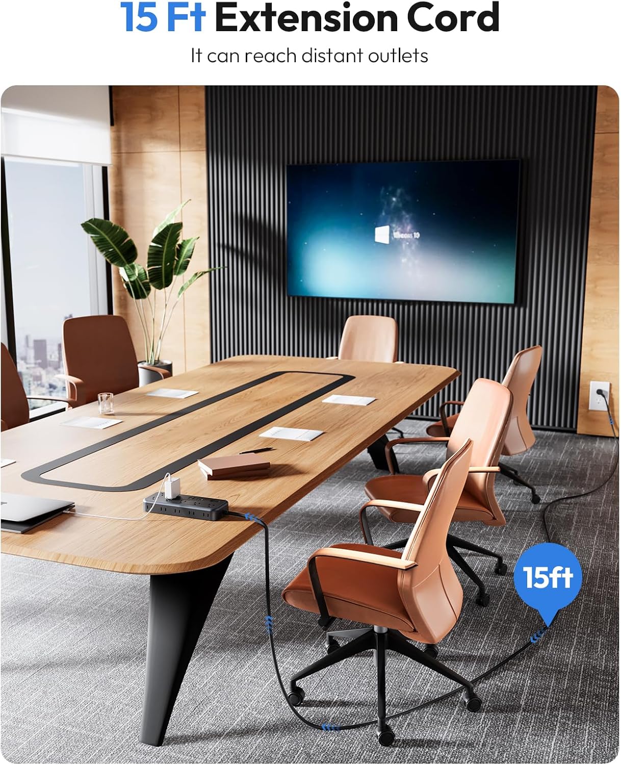 This NTONPOWER extension cord 15 ft has 14 AC outlets and 4 USB ports. It allows you to plug in all the TVs, gaming PCs, bread machines, coffee machines, USB devices, phones, laptops, desk lamps, etc., that you need in one place.