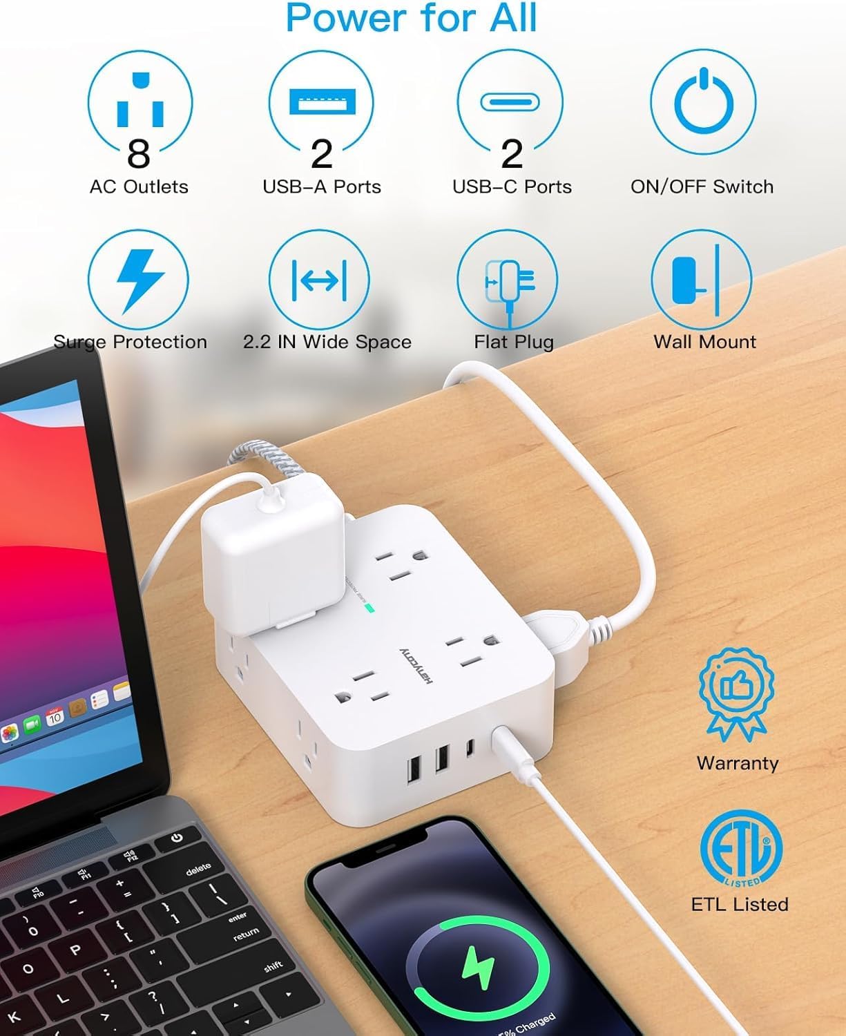 【Multi Safety Protection】Certified by RoHS and ETL, this power strip provides overload, short-circuit, overcurrent, over-voltage, and overheating protection. Its fire-resistant shell can withstand up to 1382℉, ensuring durability and a long lifespan