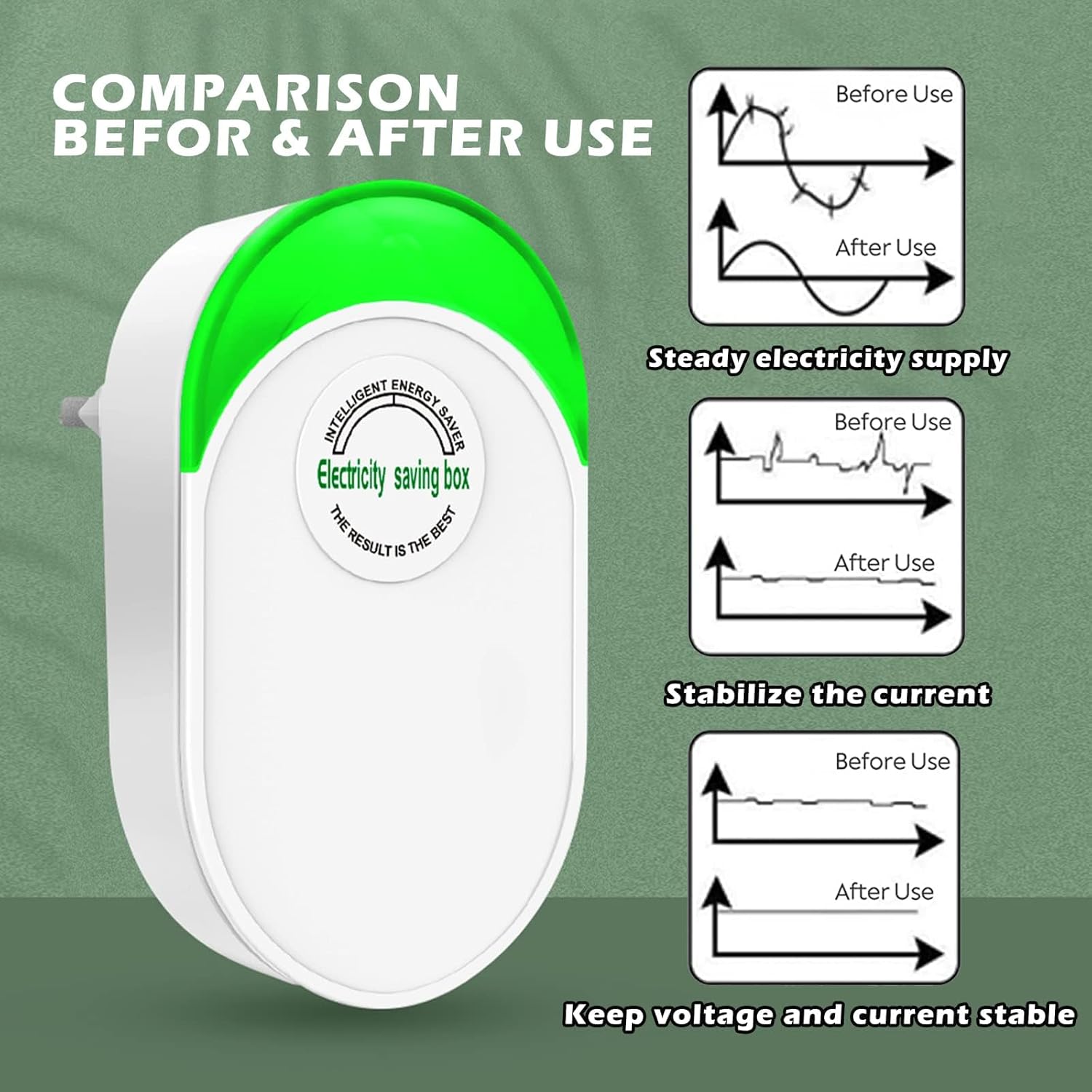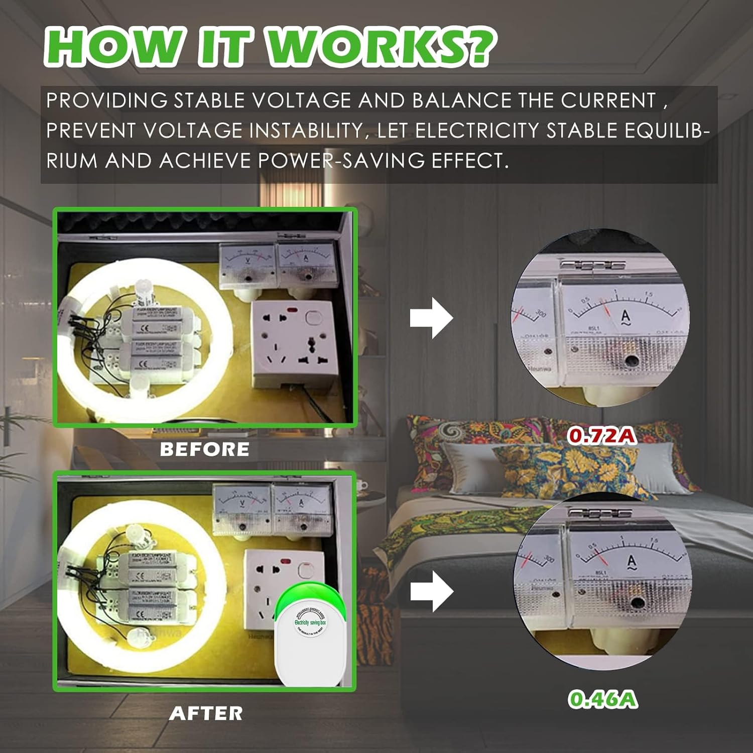 The effect of the device is that it will smooth out the electric use on the line it’s installed on. It’s not a product of immediate feedback, it help you reduce the loss in the circuit little by little, so as to achieve the effect of saving money. Therefore, the effect of the product requires time to verify.