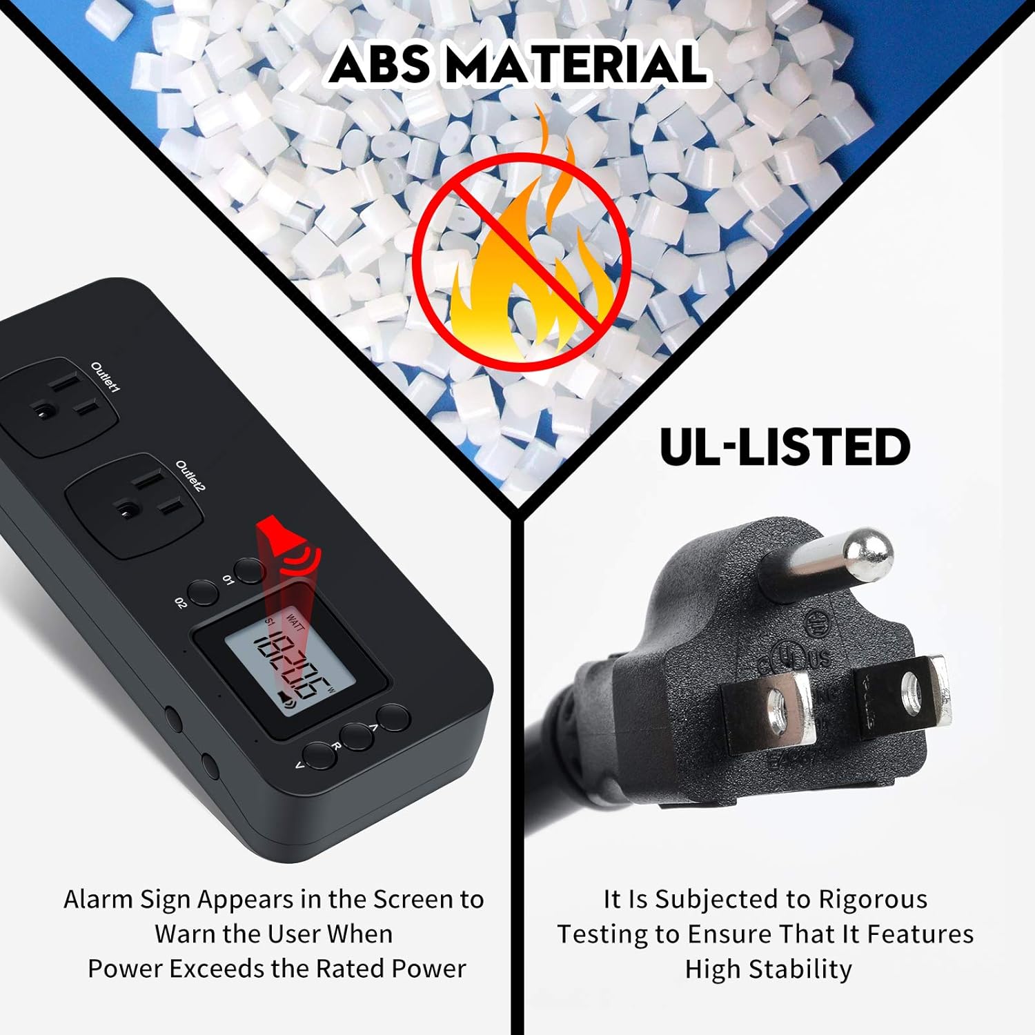 SAFETY & OVERLOAD TIP: Full ABS flame retardant material housing, and equipped with 14AWG heavy duty extension cord, performances excellent heat resistance. When the rated power exceeds 1200W, a warning will remind you to cut off the power in time