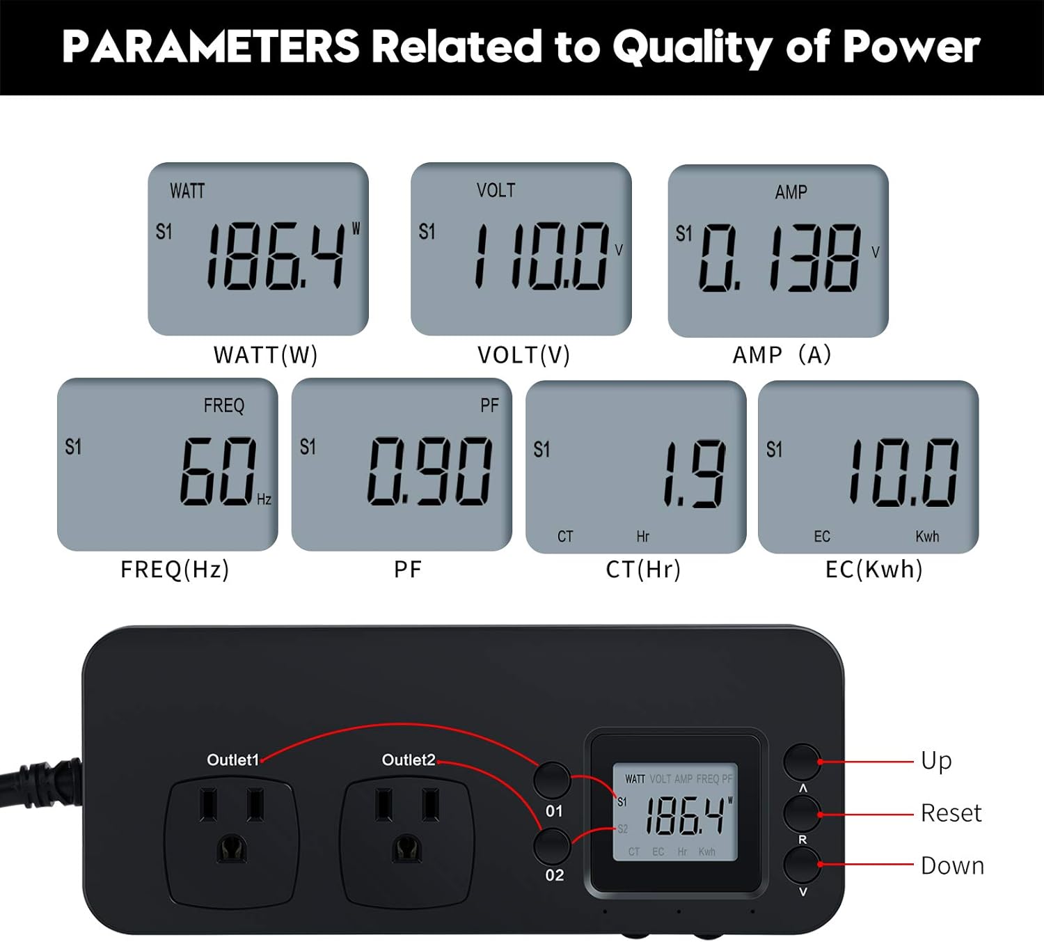 ACCURATE MONITORING: Electricity analyzer monitoring device equippeds with a high-precision current sensor and high-resolution real-time monitoring. You can measure power(W), volts, amps, hertz, kilowatt-hours(EC), cumulative time(CT) and power factor accurately