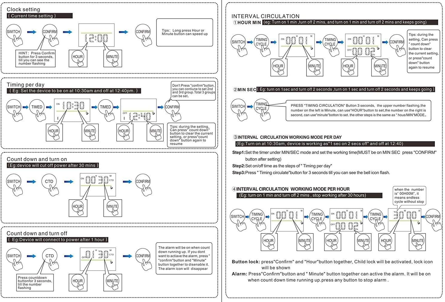 Multifunctional save energy and money: Clock setting; Timing per day (3 groups can be set at the same time); Count down and turn on/off (warning tone can be selected); Interval circulation(Infinite loop and Shortest time interval is 1 second)