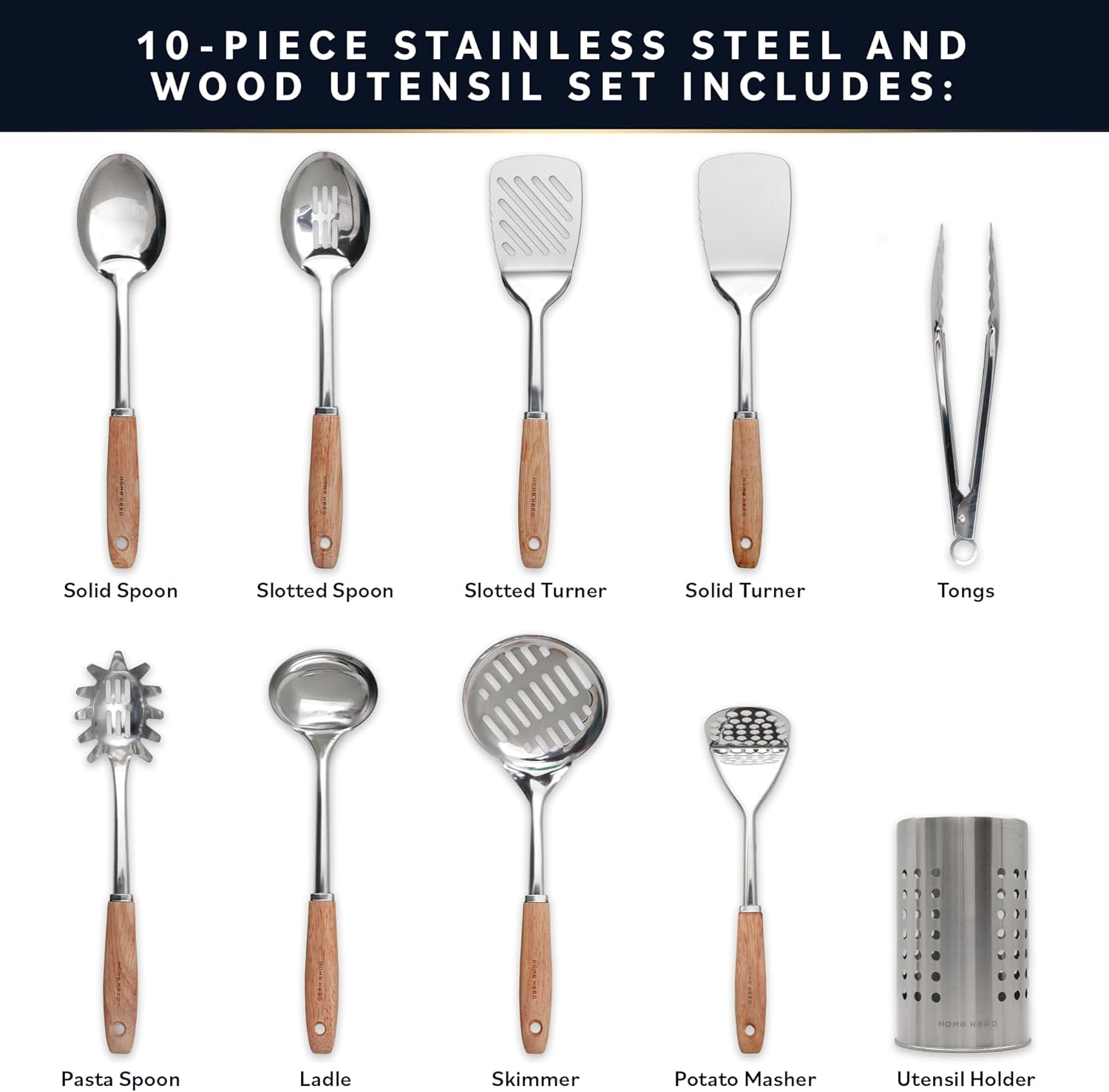 10-Pieces Essential Kitchen Utensils Set – The Home Hero premium metal cooking utensils set has everything you need to cook your favorite dish: a slotted spoon, solid spoon, skimmer, solid turner, slotted turner, ladle, tongs, potato masher, pasta spoon, and utensils holder.