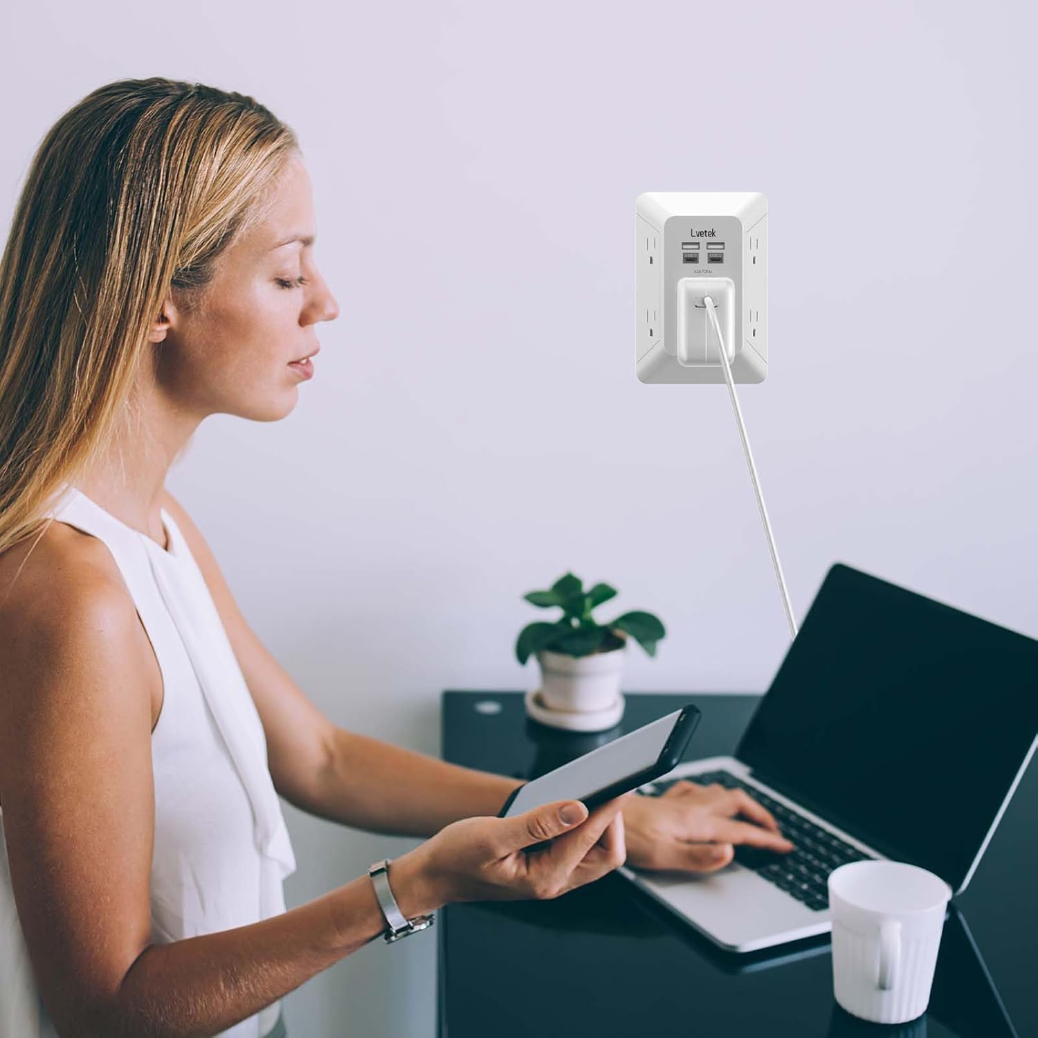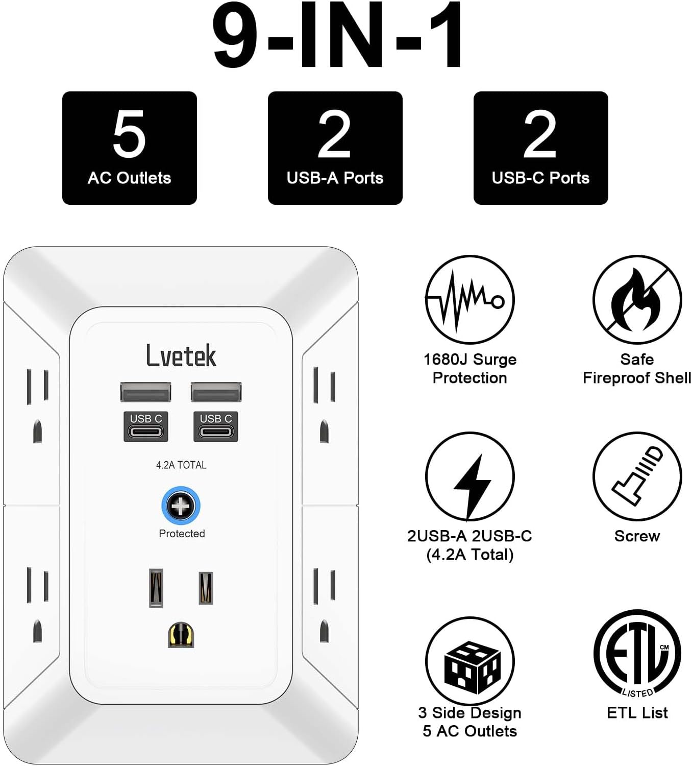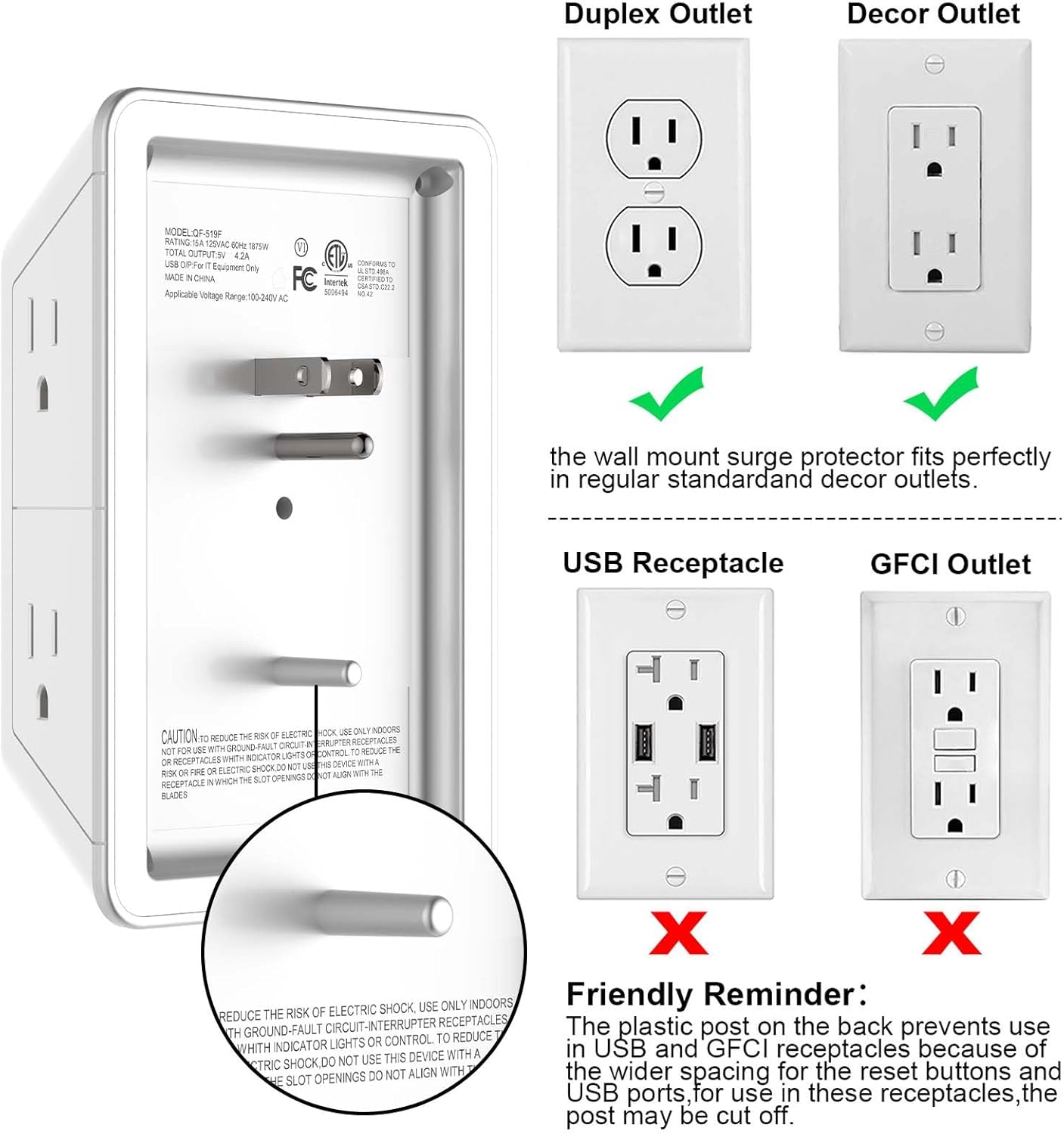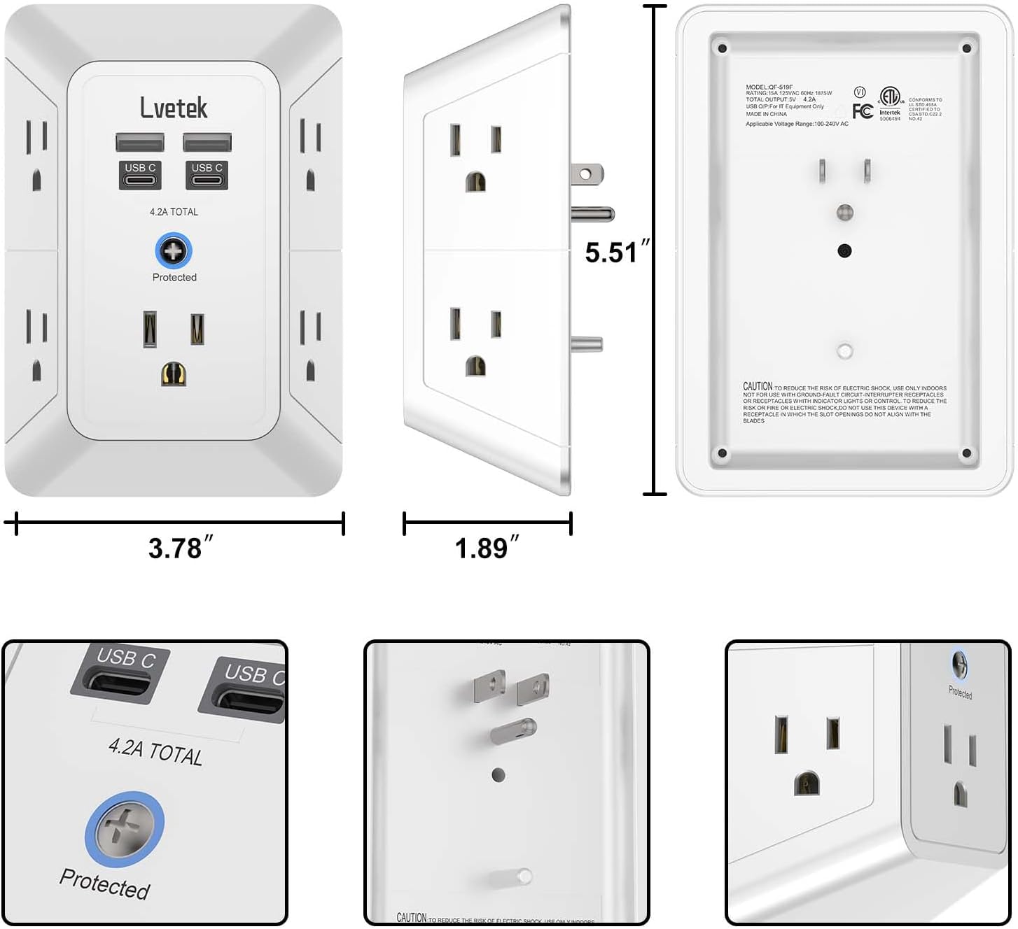 Multi-Functional Outlet Splitter:This Multi Plug Outlet Extender can turn 2 into 5, plus 4 USB Charging Ports; 1680 joules surge protector protect electronics by improving your power quality. Wall plug design, No messy power cable, No desktop space occupation, Perfect solution for dorm room, bedside.