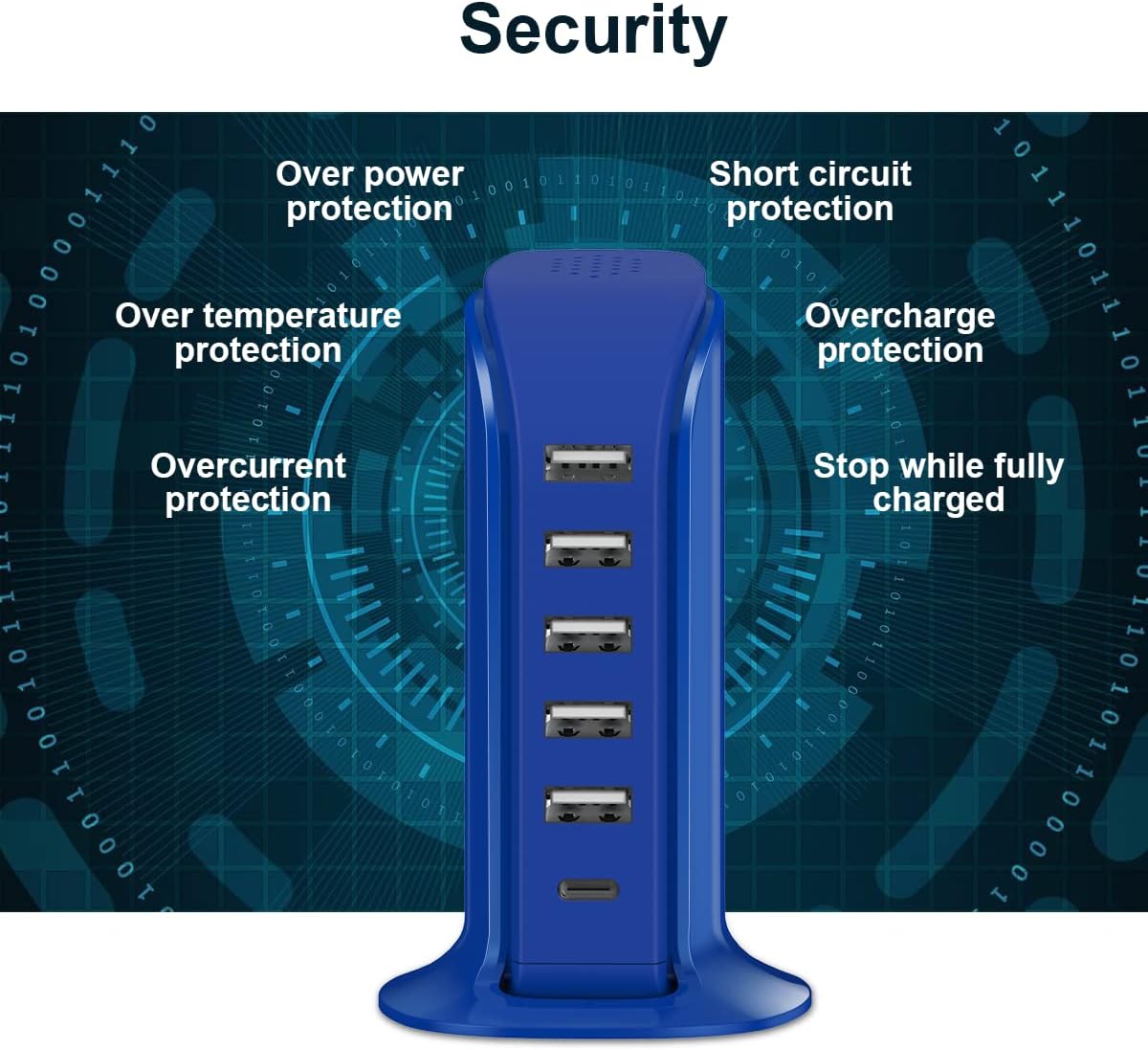 6 in 1 USB charger block with c port: Support 6 devices simultaneously, quick charger up to 2.4A for single USB port.