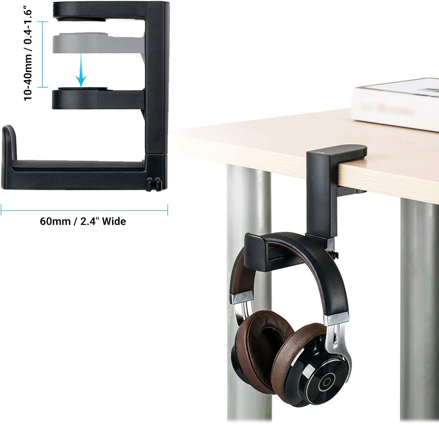 【Office Desk Organize】:Clamp on desk surfaces from 10-40mm / 0.4-1.6″ thick. This headphone stand helps you hang all kinds of headphones (such as wireless headphones, noise cancelling headphones, gaming headsets, phone headsets and so on) in place.