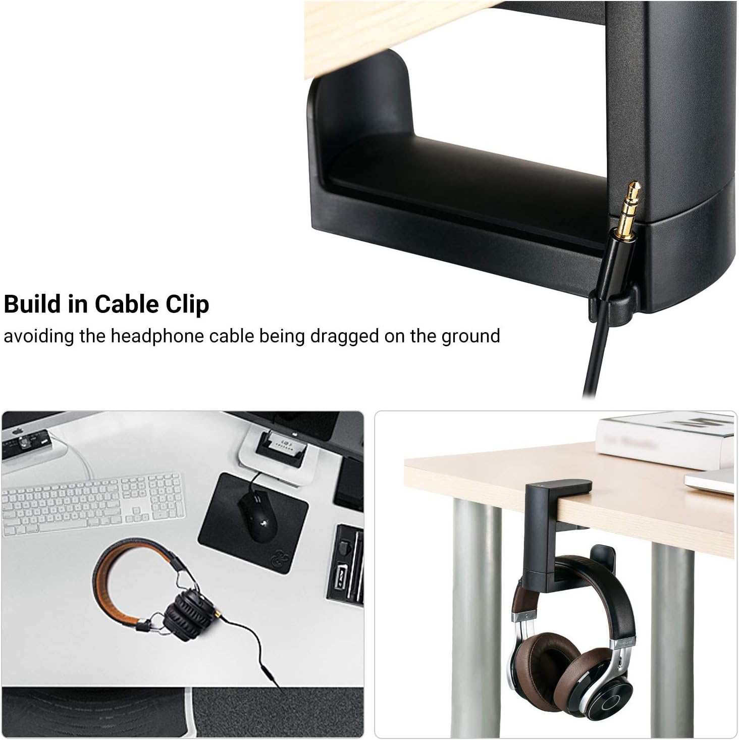 【Silicone Pad & Build in Cable Clip】:The clamp has a silicone pad to protect your desk from scratches.The built-in headphone cable clip can better keep the desktop clean, avoiding the headphone cable being dragged on the ground or caught between tables and chairs, or pulling the headphones off the table due to tripping, etc.