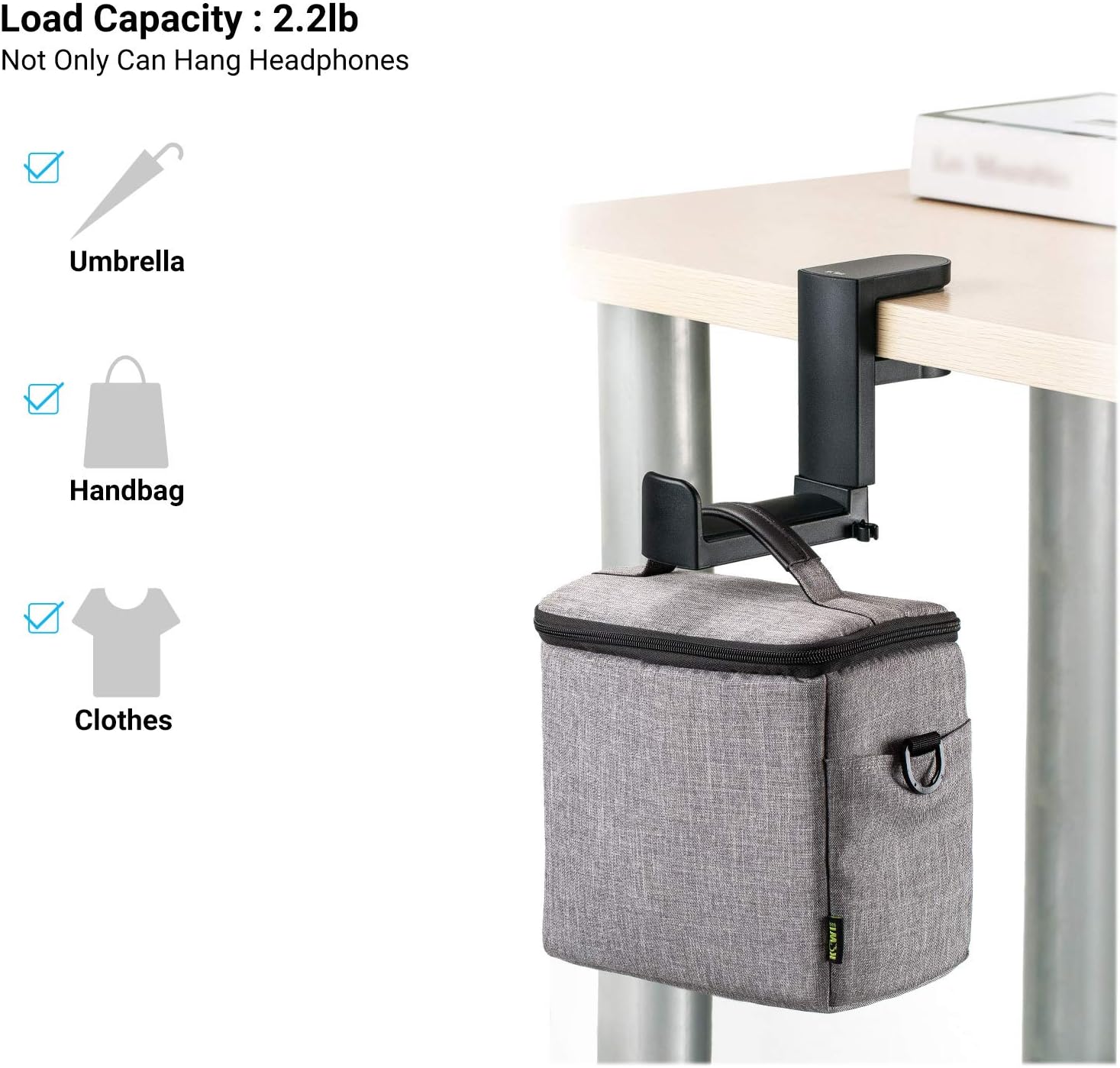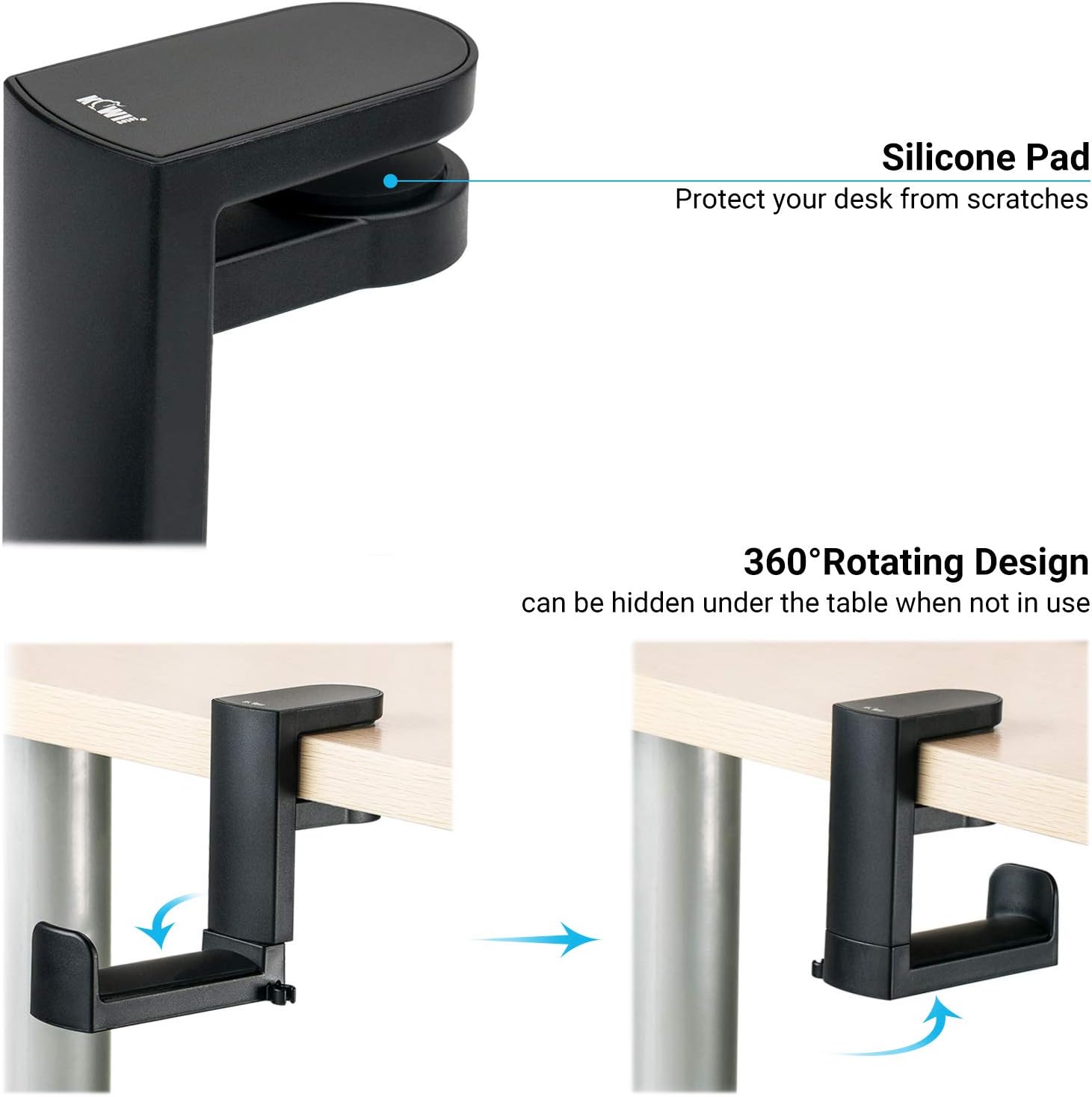 【360°Rotating Design】:The hook part can be rotated 360° that allows you to adjust the hook inward/outside/multi-directionally to save space and prevent accidental bumps. This holder keeps your desk/table tidy, clean and well organized.