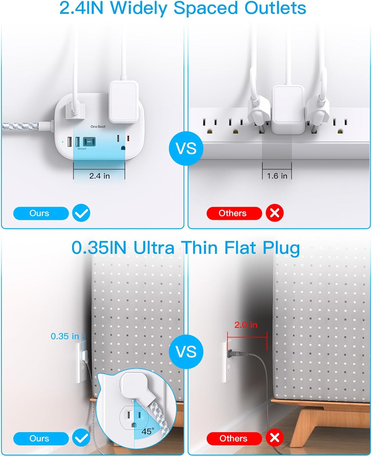 【Flat Plug Power Strip with 5ft Braided Cord】Our small power strip can fit behind dressers with 0.35” ultra thin flat wall plug design, It’s also angled at 45 degrees to help avoid blocking adjoining outlets. Other than using it for travel must have, this extension cord with multiple outlets can also be used in the home, office, guest room and camper van, or as apartment essentials for first apartment, college dorm room essentials.