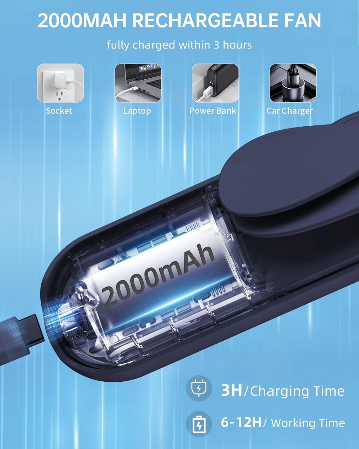 [USB Rechargeable] This portable fan comes equipped with a high-capacity 2000mAh battery, requiring only 3 hours for a full charge and providing a continuous usage of 6-12 hours. Bid farewell to the hassle of battery replacements and embrace the convenience of USB charging, allowing you to effortlessly enjoy a breath of fresh air.