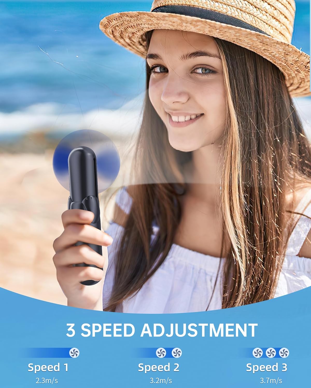 [3 Speeds & Safe Design] This handheld fan features three adjustable wind speeds, catering to your needs in various temperature. The fan blades are crafted from soft and safe materials, ensuring automatic shutdown in case of accidental contact during operation. Your safety and peace of mind are our top priorities.