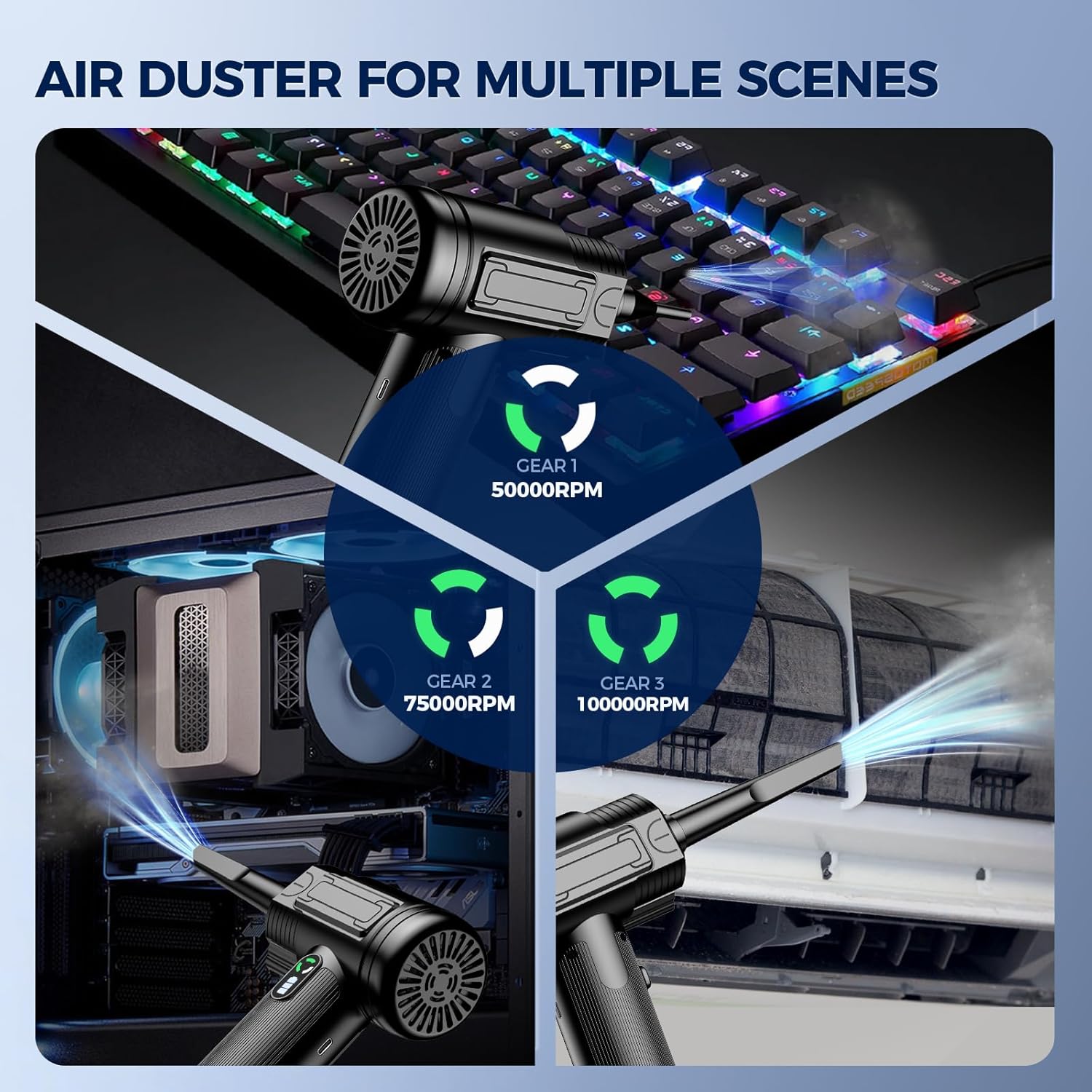 【Powerful Compressed Air】With a motor speed of up to 100,000RPM, the air duster providing 1.86-2.51 oz of blowing power. We have made a upgrade to the mini air blower with a new knob mode function design, Press 3 seconds and hold the power on, click the button, you can switch 3 airflow modes for different equipment cleaning, get ready to remove 99% of dust in just 1 minute!