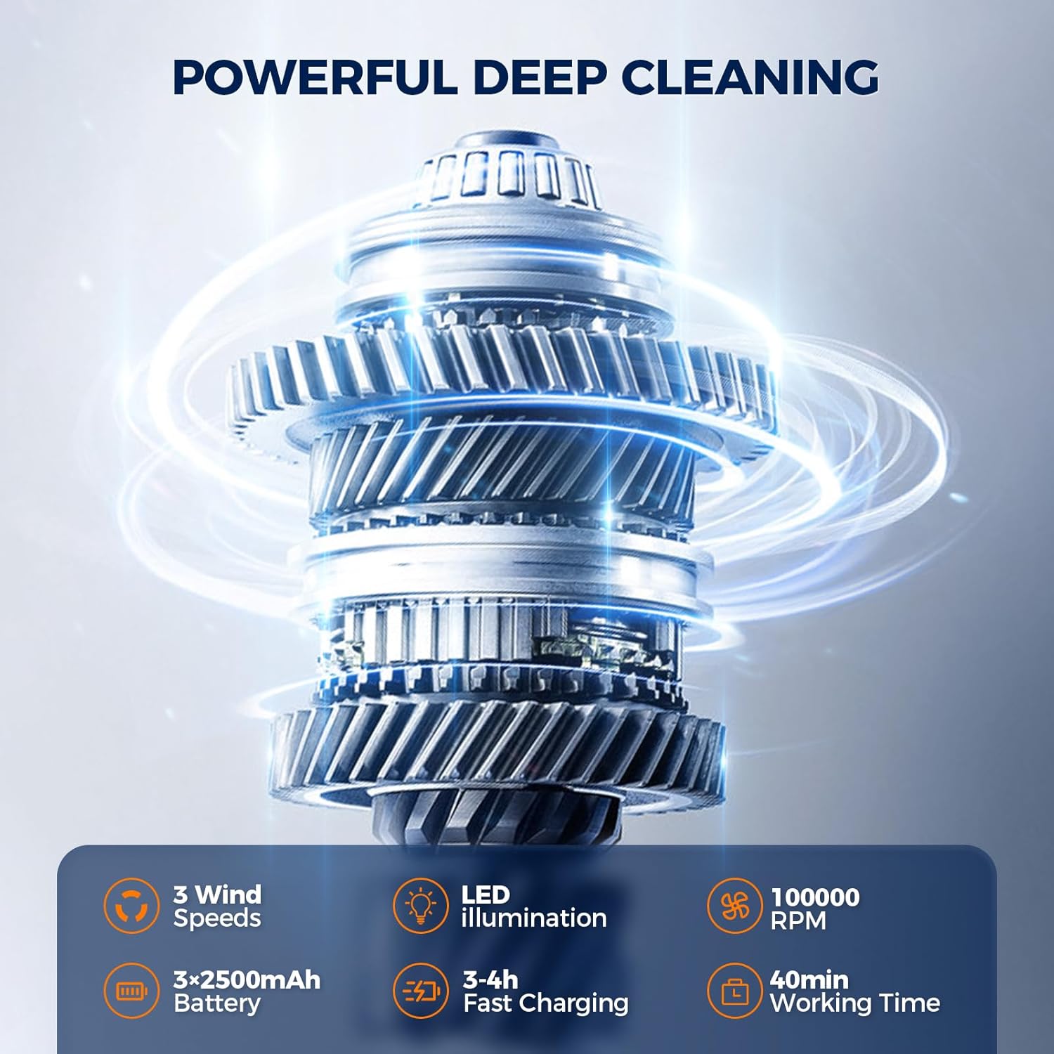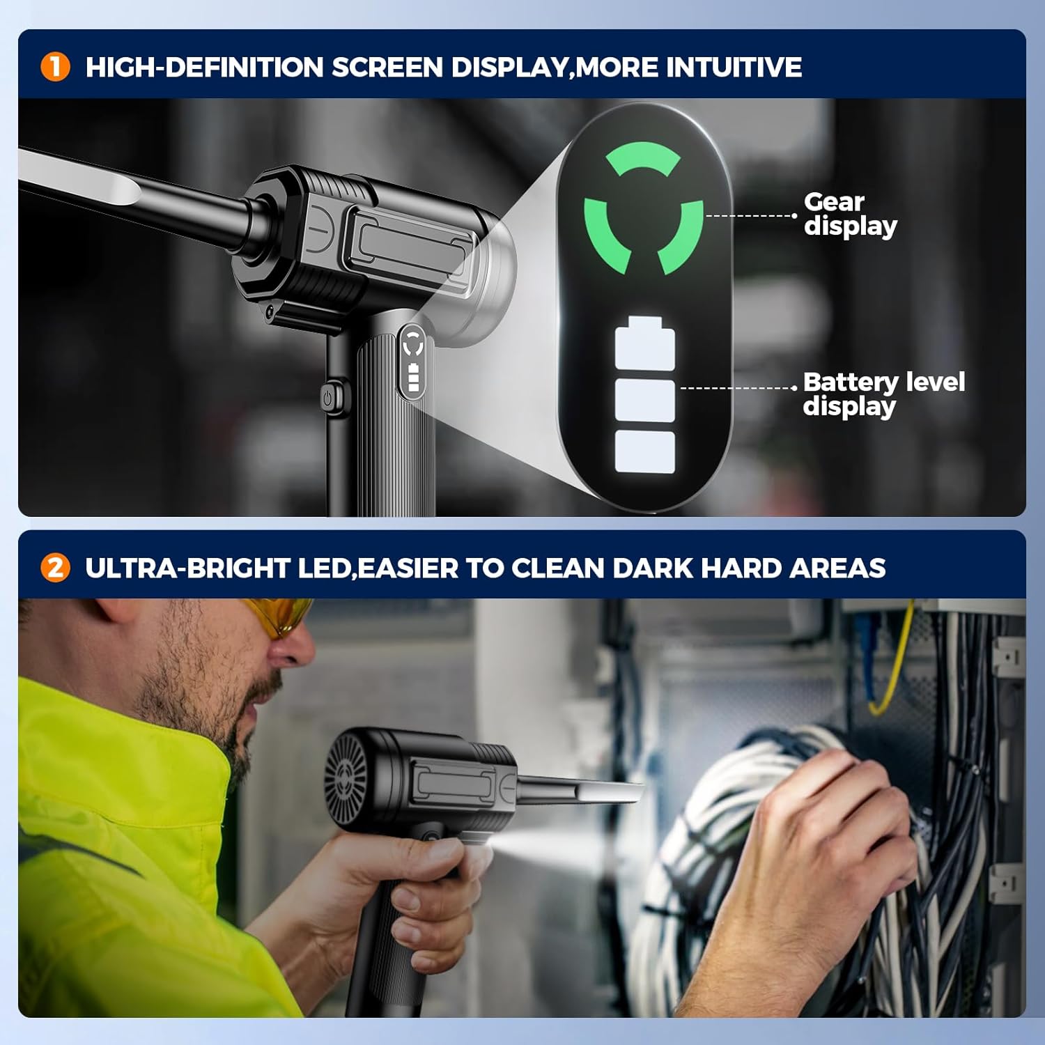 【Fast Charging & LED Display】The compressed air duster has a built-in 7500mAh battery, which can run continuously for 20-40 minutes. Comes with USB-C fast charging cable, fully charged within 3-4 hours, high-definition LED display screen which allows you to view the remaining battery level and the wind gear. Rechargeable air duster designed for deep cleaning, the built-in LED light illuminates your cleaning area upon activation.