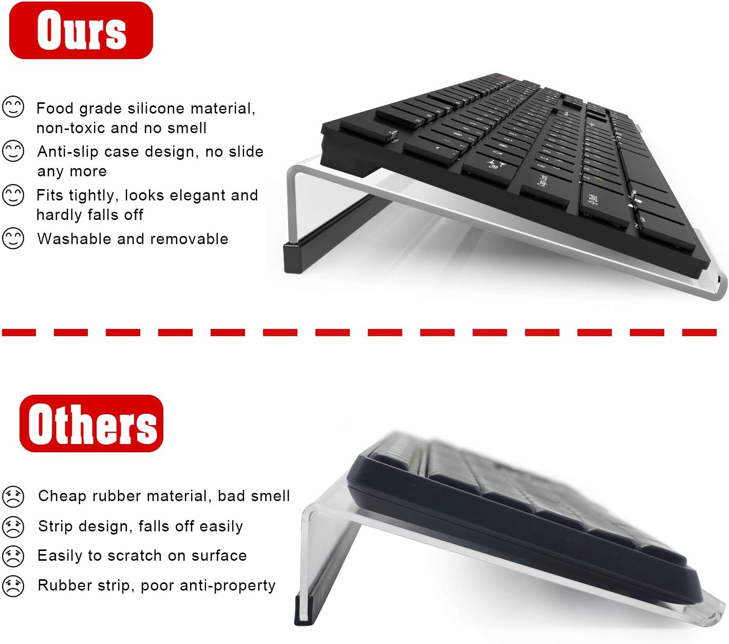 Grade A top quality premium clear acrylic, say No to recycle material.Fully covered food grade silicone anti-slip case from back, refuse rubber strip.Angled for comfortable reading and typing, keeps you away from wrist issues.Low front lip on the end, won’t collide your wrist for more comfortable typing.Universal design which fits most full size standard keyboards.Sophisticated manufacturing process ensures smooth rounded edges and corners with polished finishing.