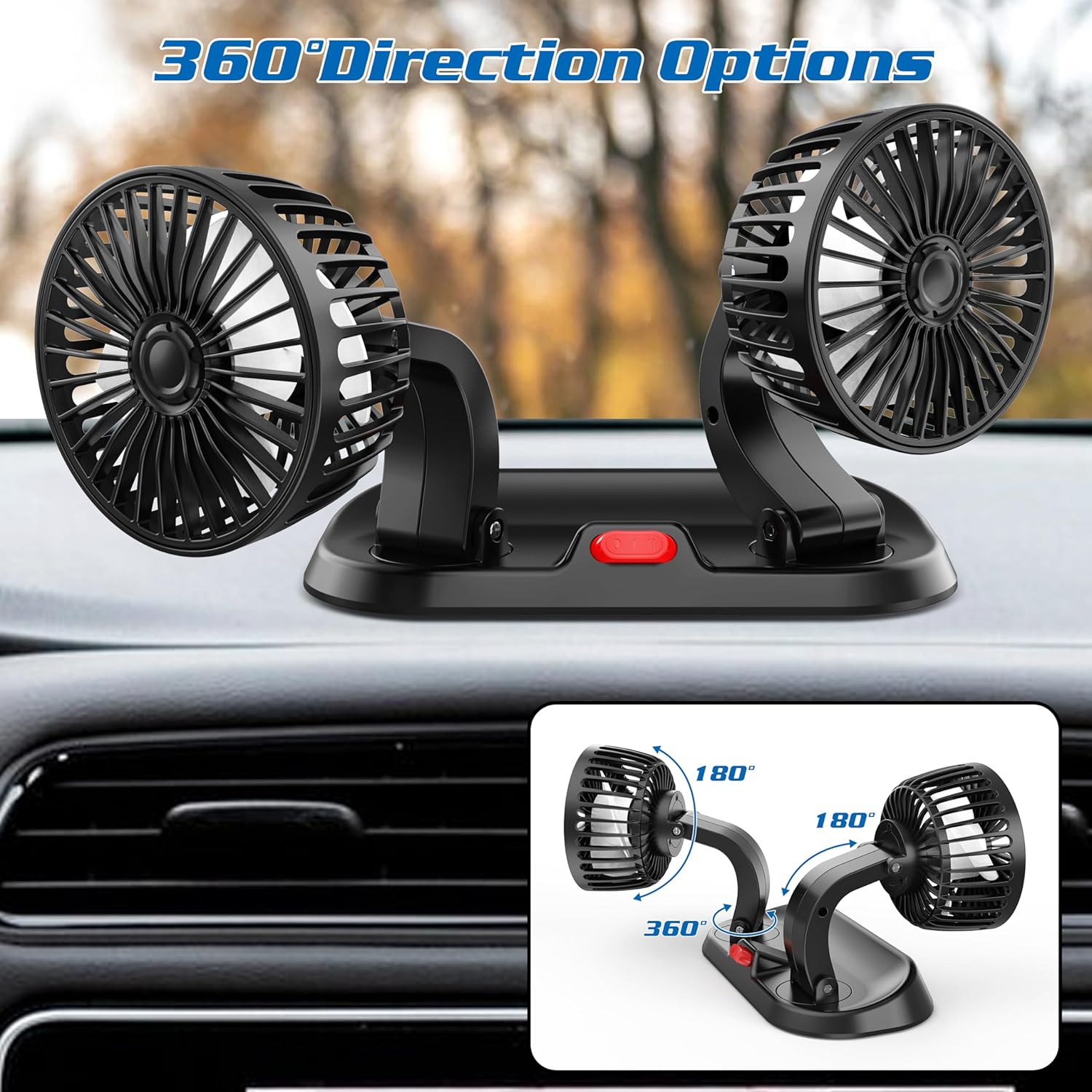【Unique Extension Arm Design Portable Fan】- Designed with 360° rotate arms, this dual-head fans can easily clip on any surface and holds firmly, making sure that it covers all areas of your car. Unique extended arm that allows the fan head to be adjusted to a lower position to avoid blocking the driving view. A great portable fan on the coming hot day.
