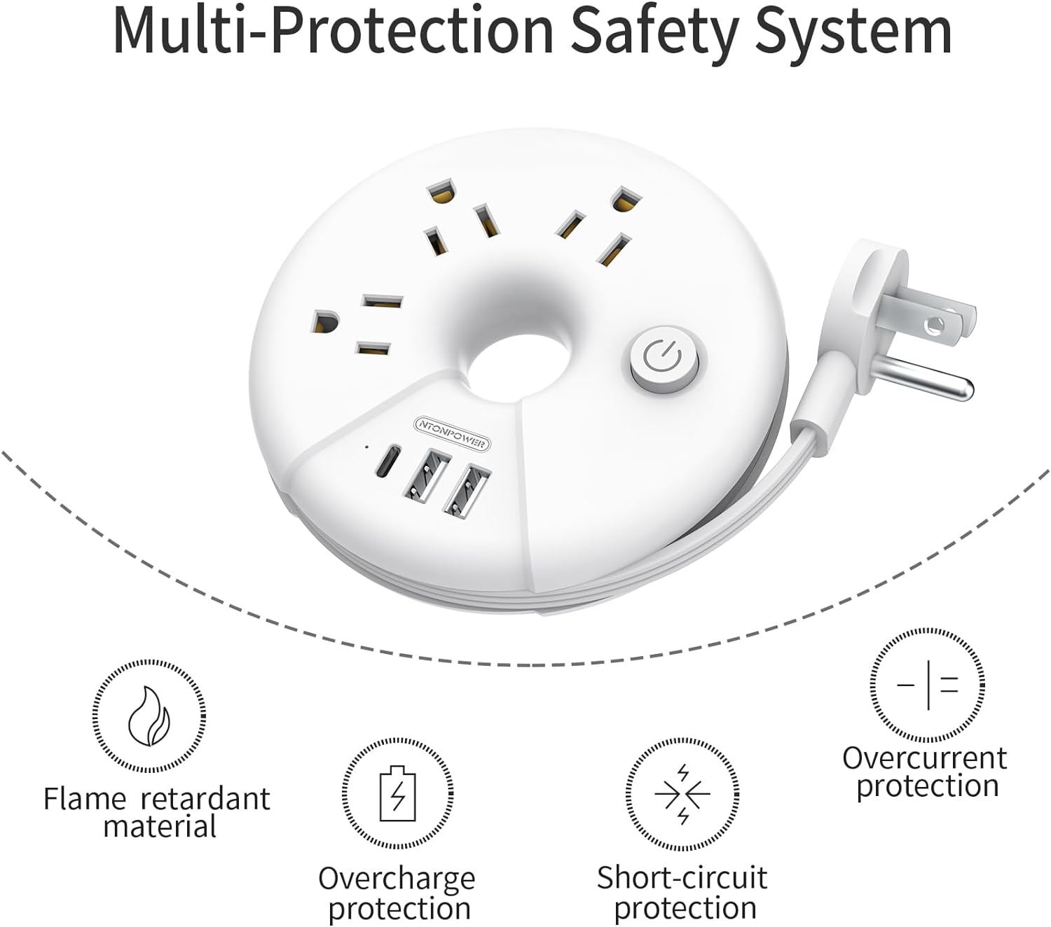 [FULL-ROUND PROTECTIONS]: The travel cruise power strip is FCC & RoHS approved with high temp fireshield outer shell, ensuring complete protection against electrical short circuit, over heat, over charging, over current and over voltage