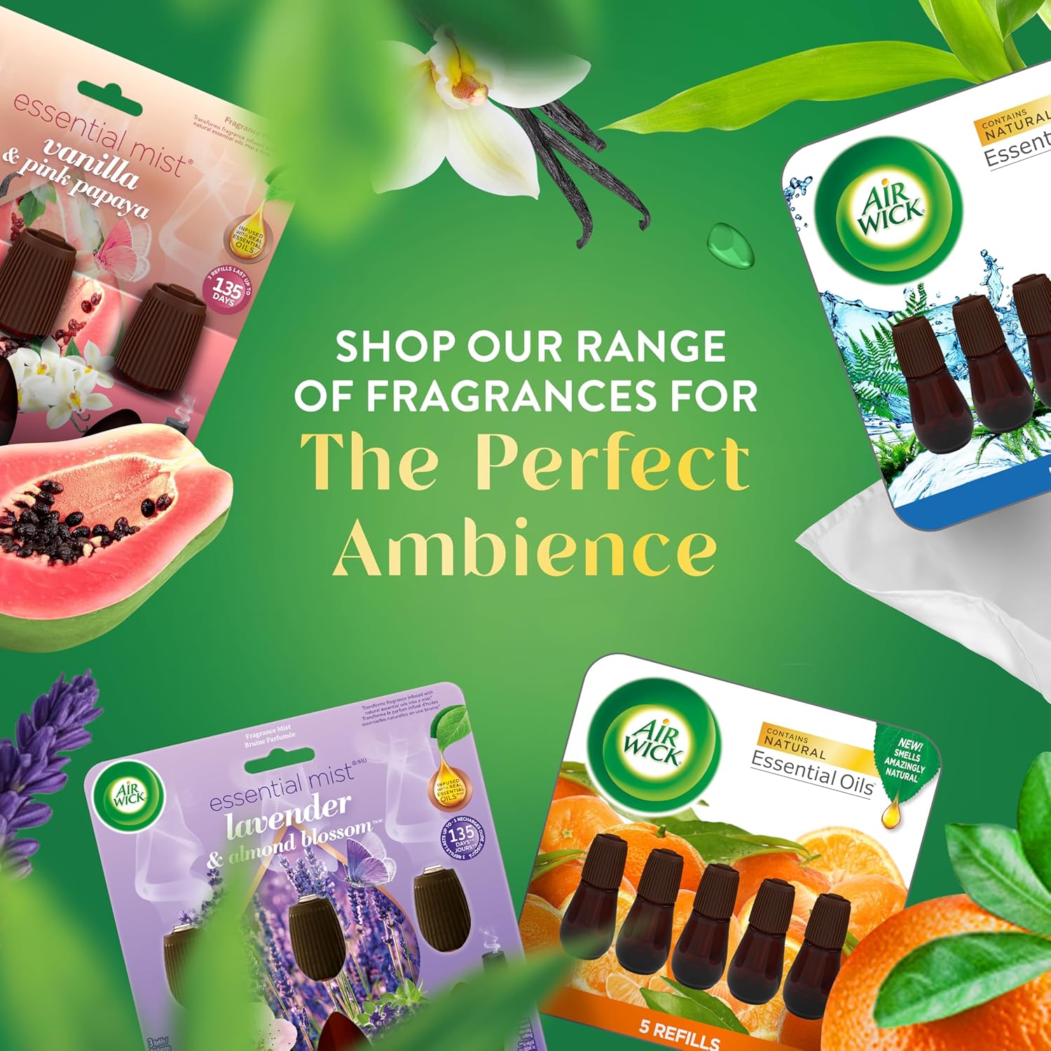 Discover the more natural and premium fragrance infused with natural essential oils diffused by mist with Air Wick Essential Mist diffuser. It transforms fragrance infused with natural essential oils into a gentle mist that surrounds your home. Several premium fragrances available in refills: Lavender and Almond Blossom, Mandarin and Sweet Tangerine, Coconut and Pineapple, Peony and Jasmine, Sandalwood, Sweet Melon and Vanilla; seasonal scents like Apple Cinnamon Medley, Pumpkin Spice, Sweet Fruit and Nutmeg, Brown Sugar and Vanilla, Fresh Pine and Juniper and, our Aroma range with Happiness, Sleep, Unwind and Rejuvenate.