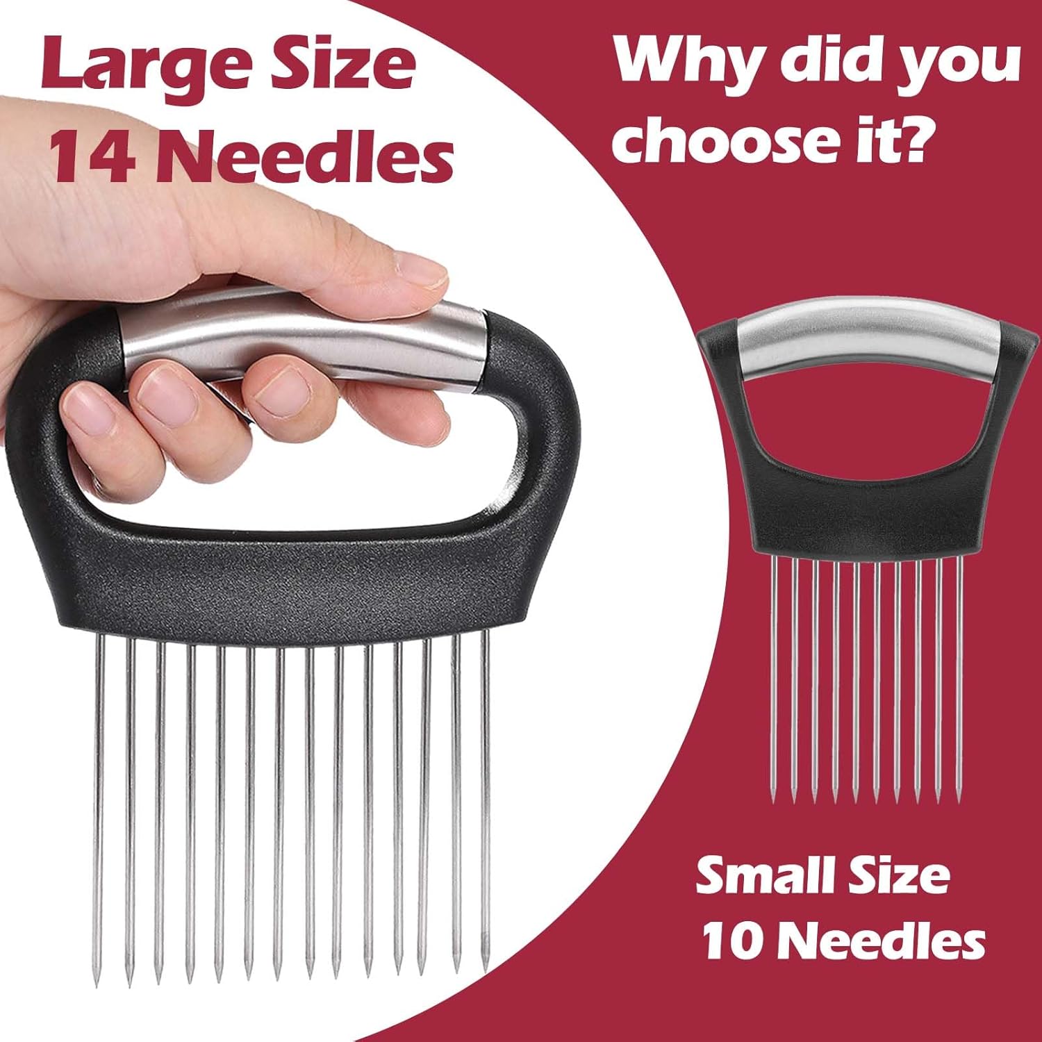 Large Onion Slicer with 14 Long Needle: This versatile kitchen tool is a game-changer in the cooking. Its unique 14 stainless steel forks under the handle provide a comfortable grip, ensuring neat slicing of onions, tomatoes, and lemons without slippage, prevent slippage while cutting with the comfortable handle of the Onion Holder Slicer