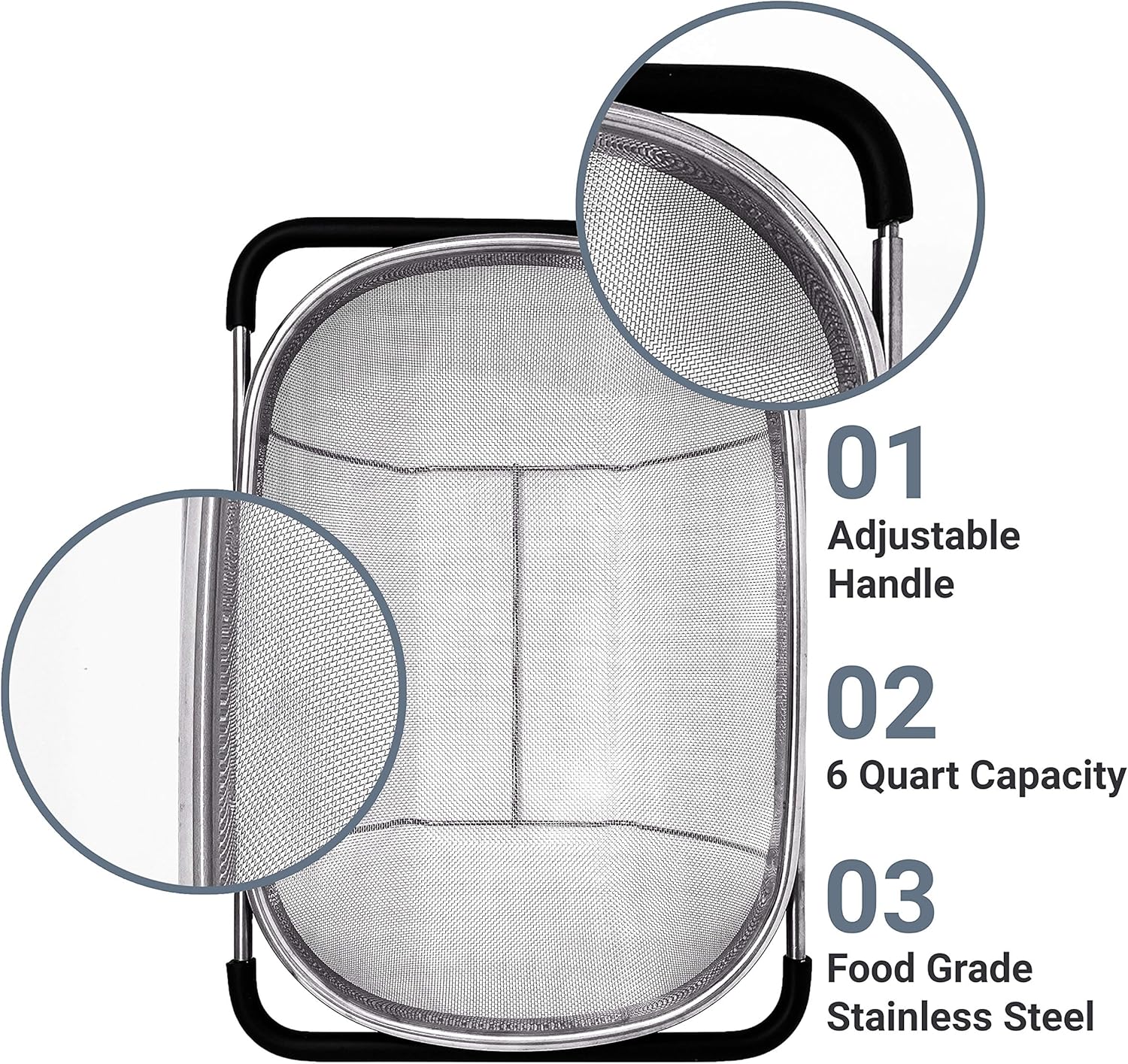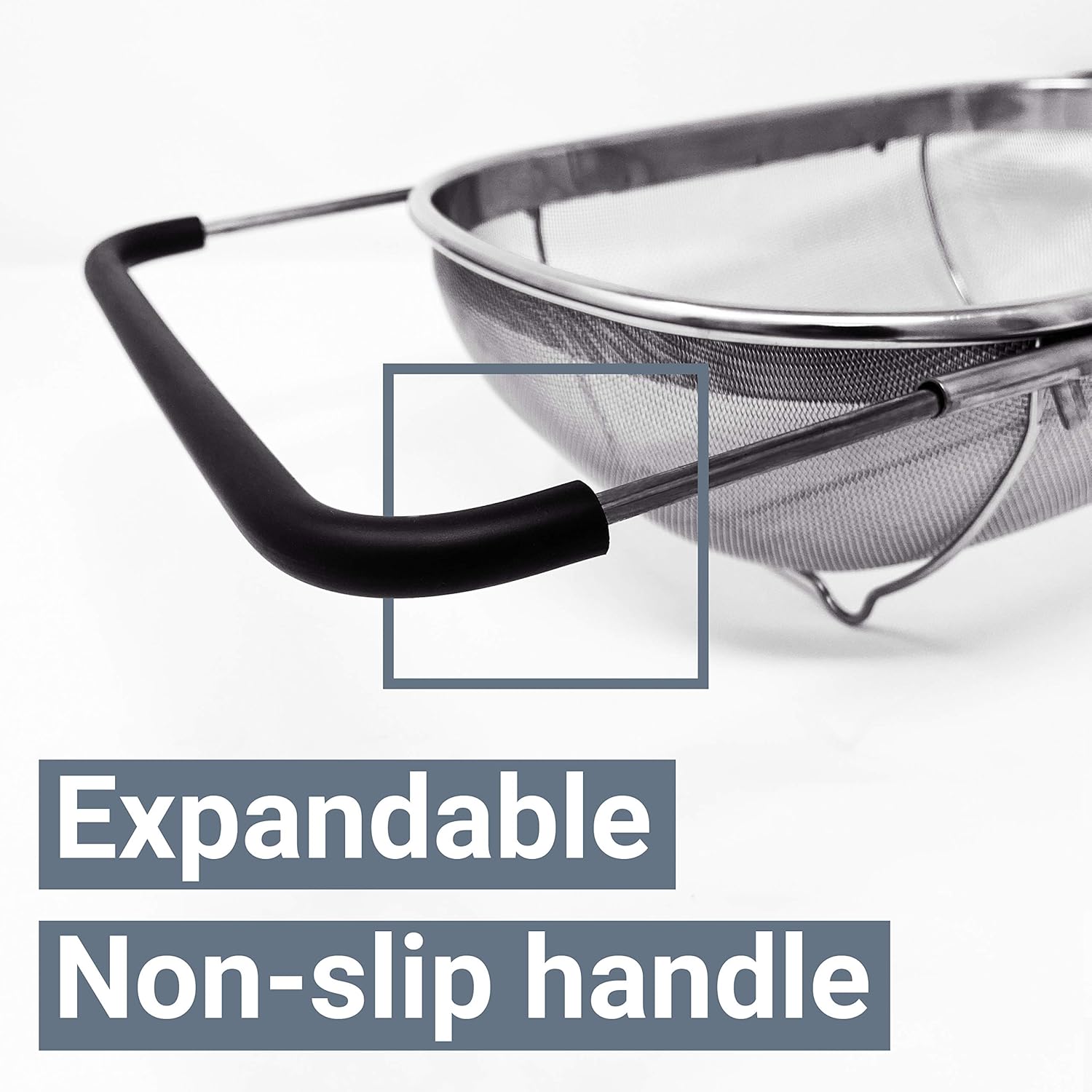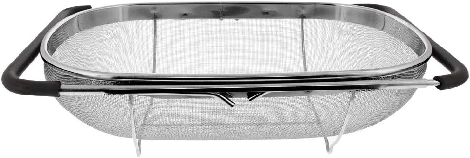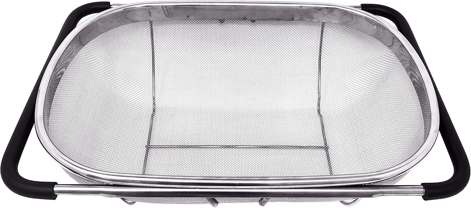 Expandable The rubber handles are expandable giving you options to use it over the sink. You can also collapse the handles and use it in the sink, even more so because of its strong and convenient frame with feet on the bottom.