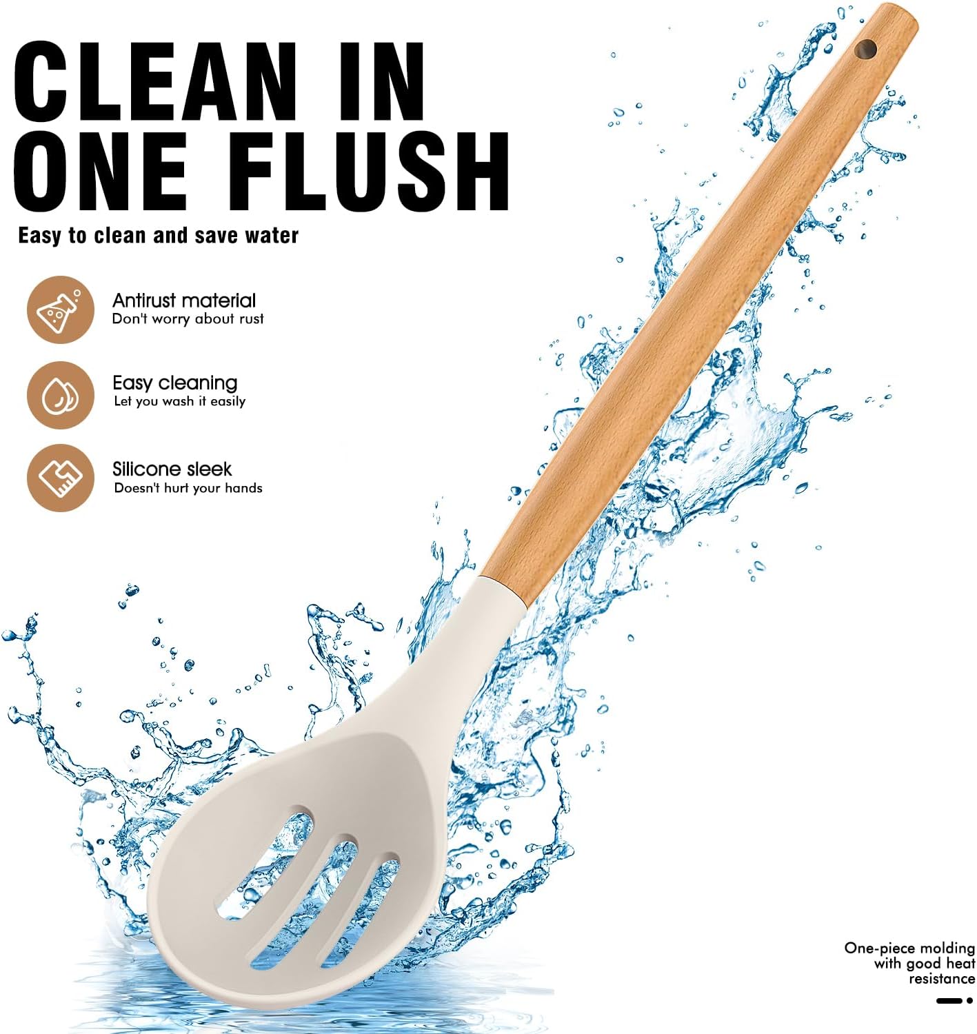 Designed to withstand temperatures up to 446°F, our silicone kitchen utensils set is perfect for high-temperature frying. The non-melting silicone and high-quality natural wood handles prevent heat transfer during cooking, ensuring both durability and safety.