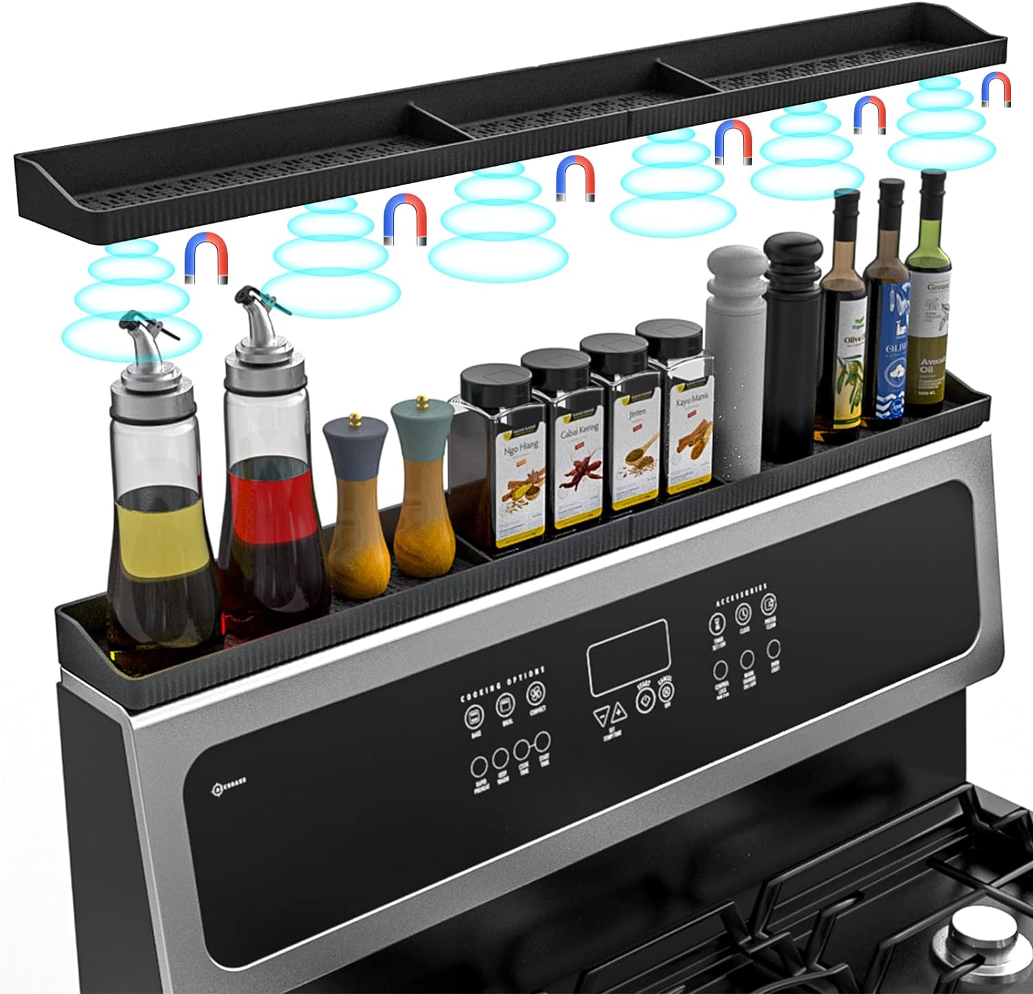 Space saving: No need installation, just place this magnetic silicone shelf on the top of your oven stove, and it can help you organize spices and condiments, great for getting your spices without mess when cooking,also won’t take up valuable counter space, save more space.