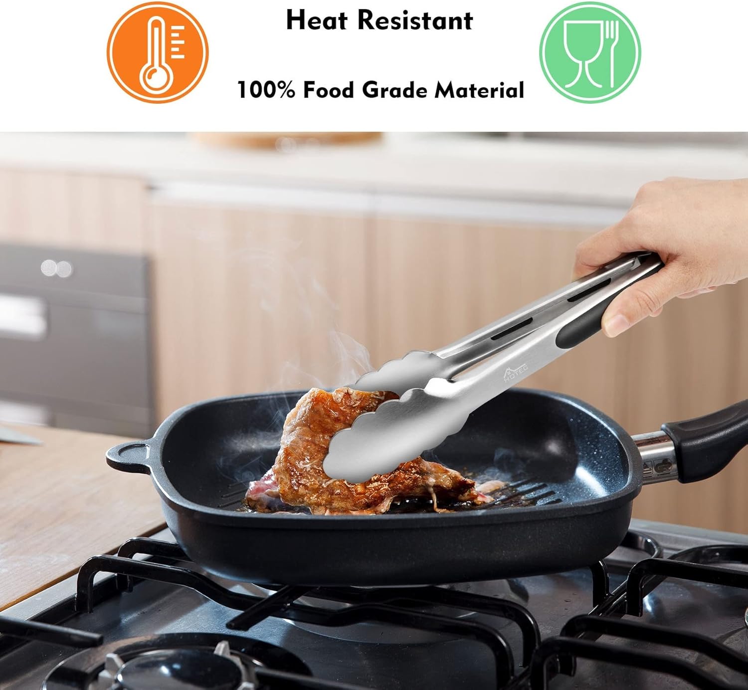 Hotec tongs have strong structure, won’t bend, chip, break. Scalloped edges head easy to grab food.