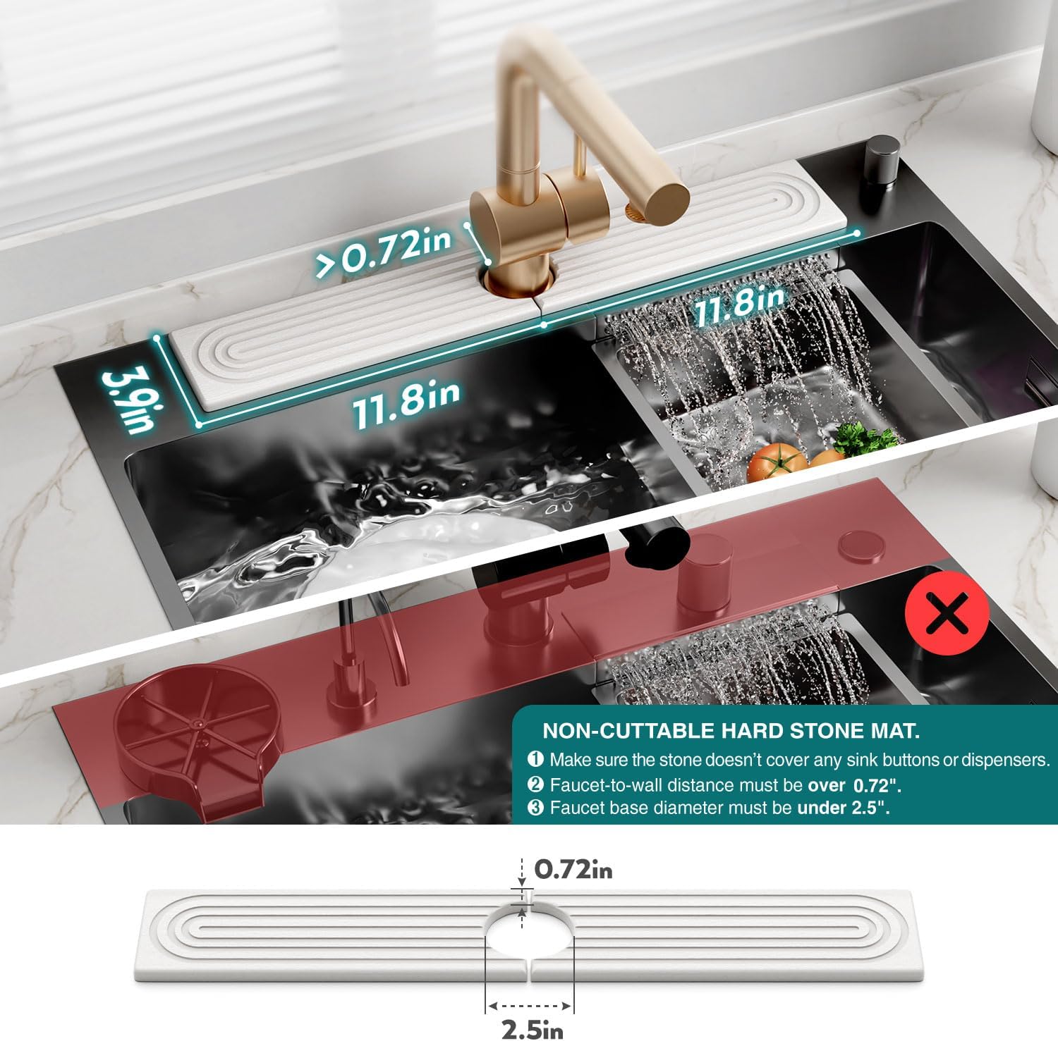 ๐๐๐๐จ๐ซ๐ ๐ฉ๐ฎ๐ซ๐๐ก๐๐ฌ๐ข๐ง๐ : โ Based on the product size, make sure the stone wonโt cover any sink buttons or dispensers. โ Faucet-to-wall distance must be over 0.72″. โ Faucet base diameter must be under 2.5″. | Size: 23.6″ x 3.9″ x 0.4″, with a 2.5″ center hole. NON-CUTTABLE HARD STONE MAT.