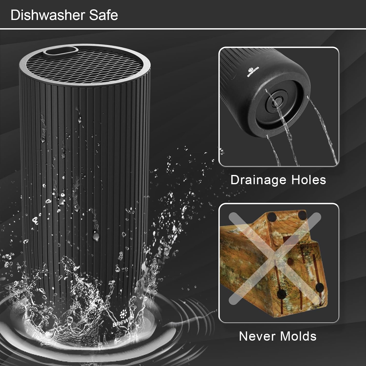DISHWASHER SAFE – Our aesthetic knife block is made of high density polypropylene, with drainage holes at the bottom. Both knives and block are dishwasher safe.