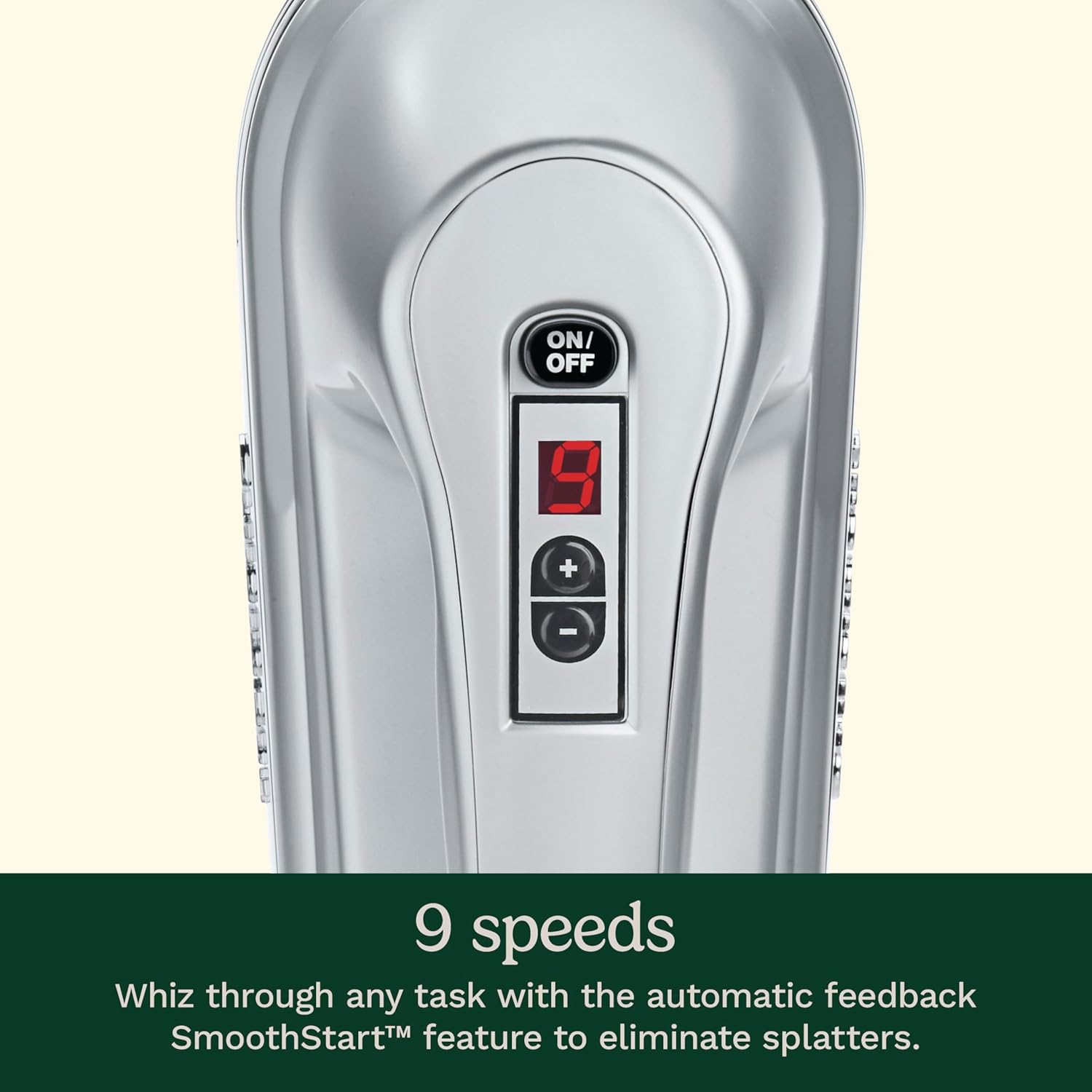 SUPERIOR PERFORMANCE: The Cuisinart Power Advantage Plus 9-speed hand mixer has 220 watts of power with automatic feedback including SmoothStart feature with 3-low mixing speeds that eliminates splattering