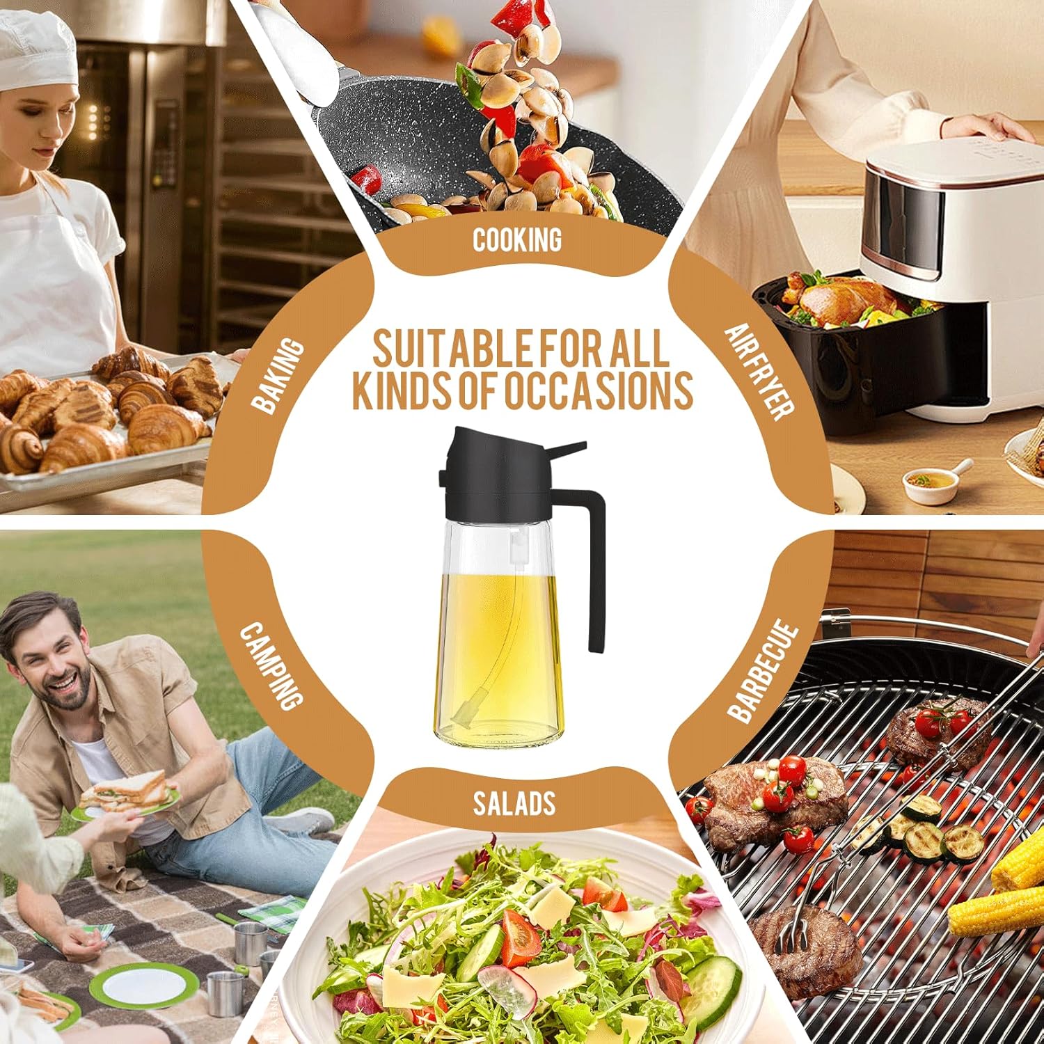 2 IN 1 DESIGN-oil dispenser and oil sprayer, can spray oil to control the intake of fats and oils, also can be convenient to pour oil, suitable for seasoning,,, grilling, baking and other food preparation process.