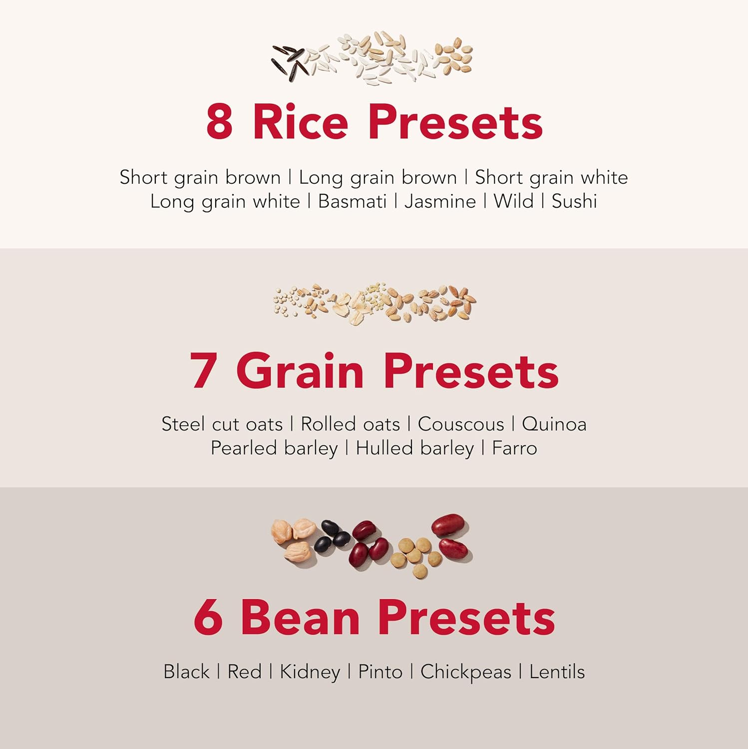 Explore a whole new world of whole grains with 21 preset options for rice, beans, oats, couscous, quinoa, barley, farro and more