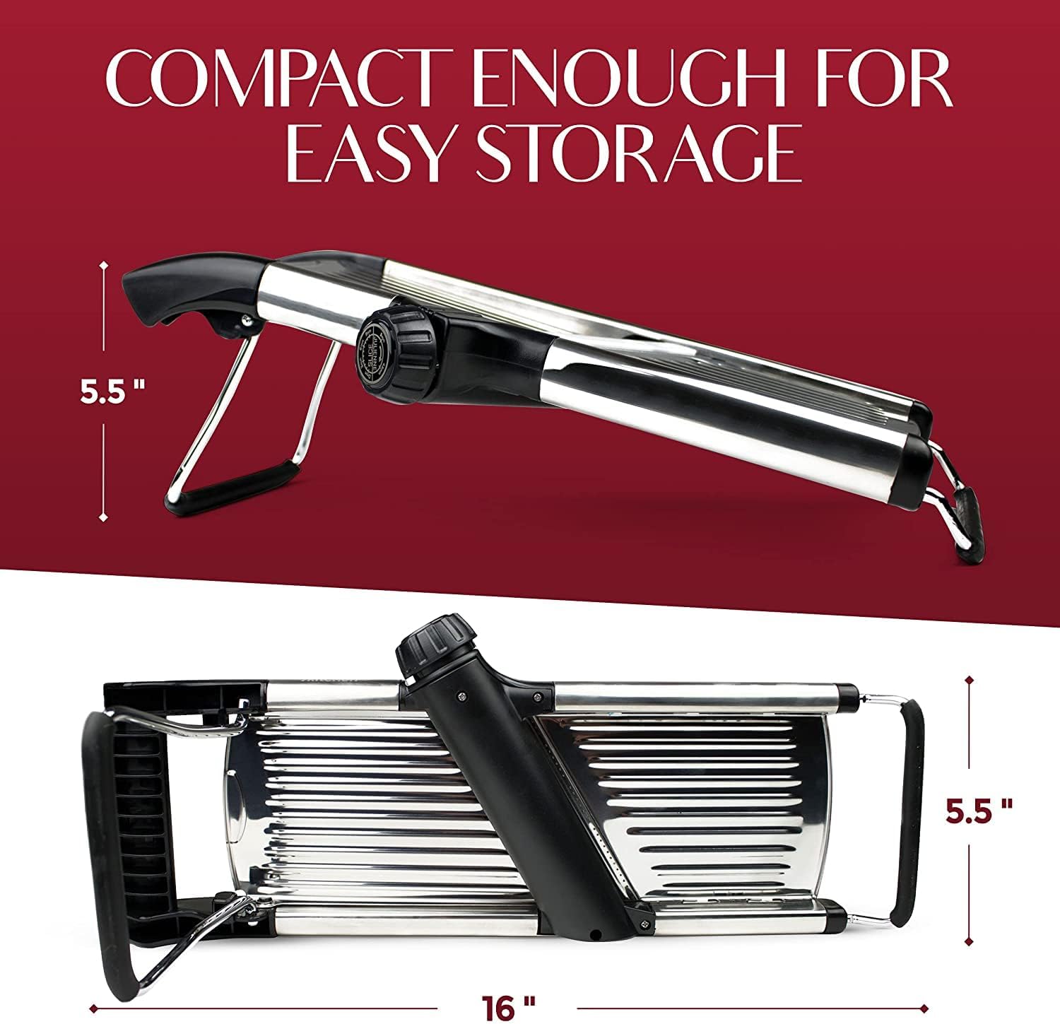 Folds flat for storage.Removable blade dial for cleaning.Professional, stainless steel construction.Rinses clean with soap and water.Food safety holder and slicer are top-rack dishwasher safe