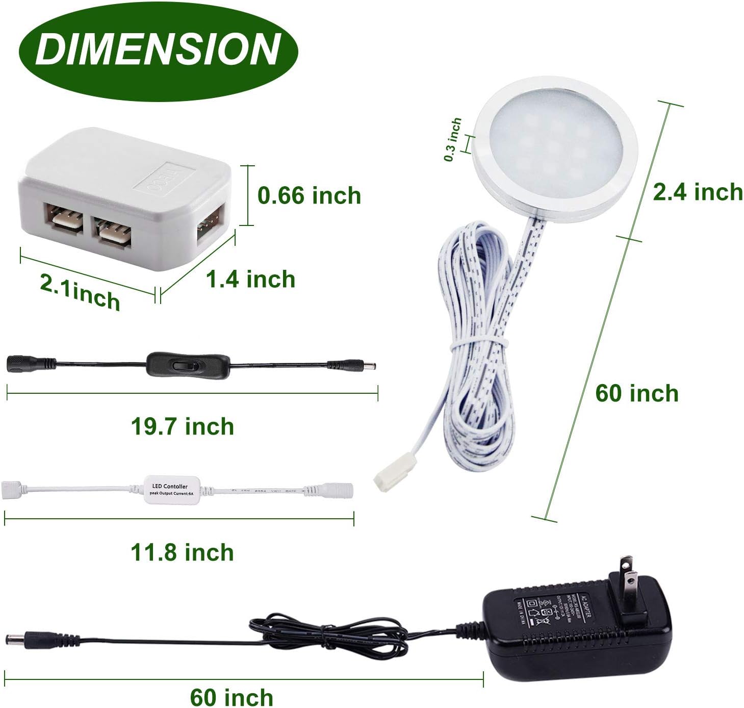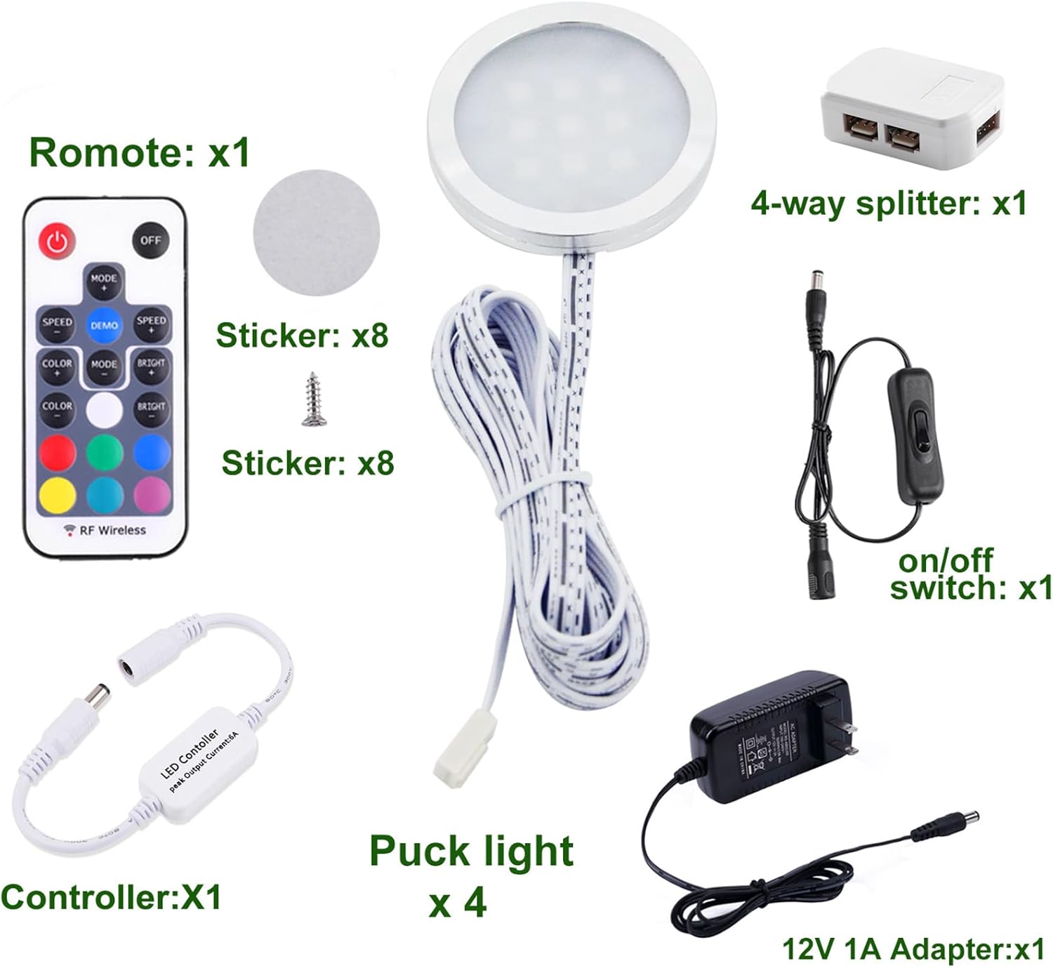 Power Adapter X1 With 59 inches power cable ON/OFF Switch Cable X1 With a manual switch RGB LED Puck Lights X4 Each puck light with 9 lamp beads RF Remote X1 A 18 keys multi-function remote LED Controller X1 To be a receiver used with the remote Remote Bracket X1 To hold on the remote somewhere 4 Way Splitter X1 4-pin white junction box with 4 ports Stickers X8 Installation items Screws X8 Installation items
