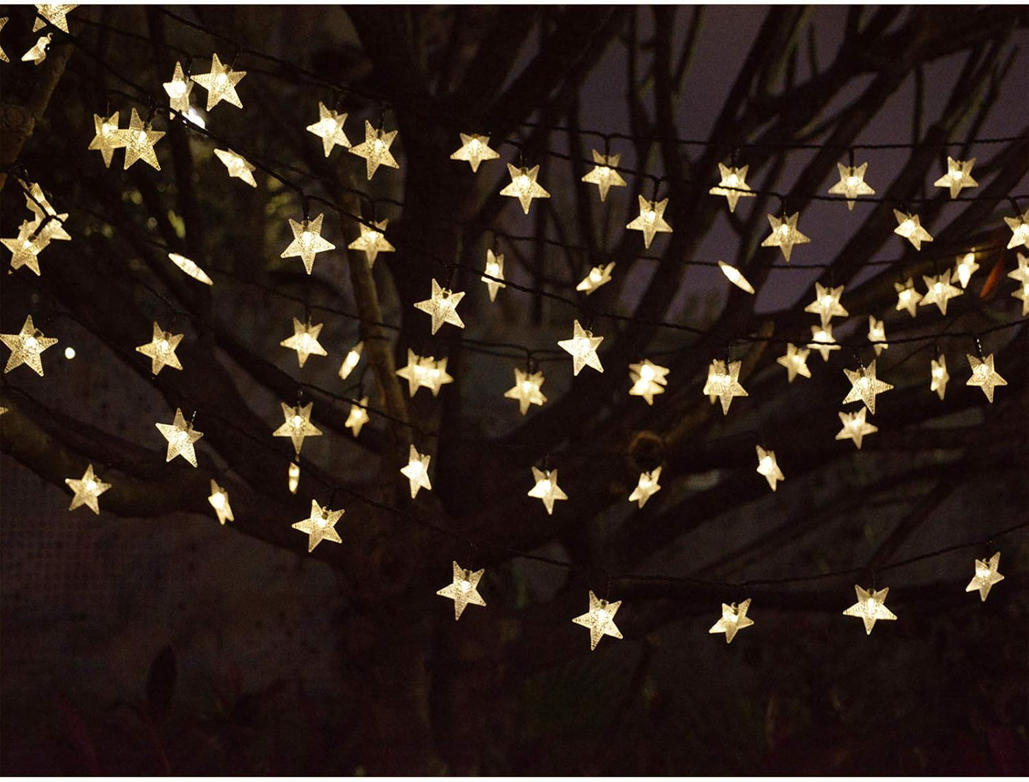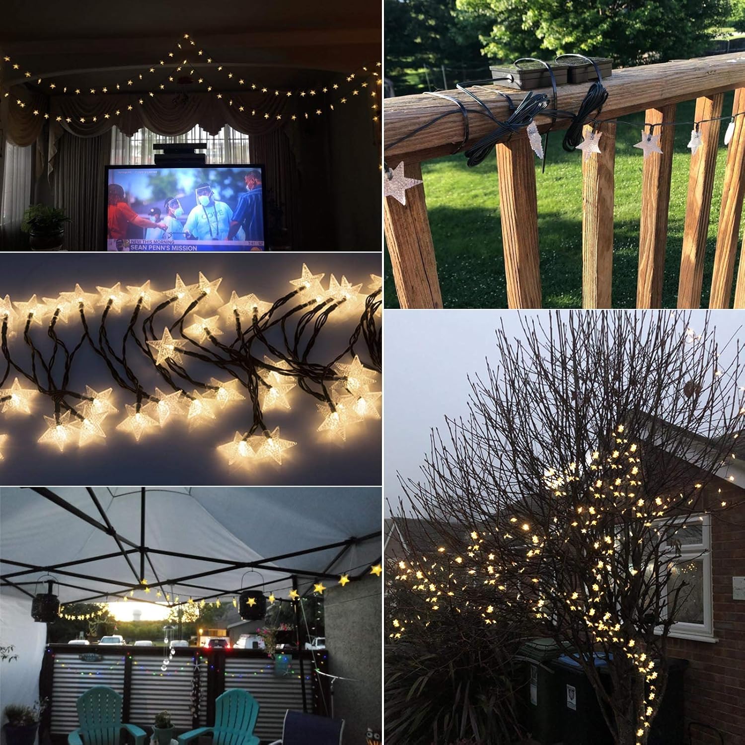 Lots of Star Fairy Lights: 120 warm white super cute star lights, 50ft lighted string wire, 6.5ft lead wire,55ft total length, 4.9 inch distance between LED bulbs.