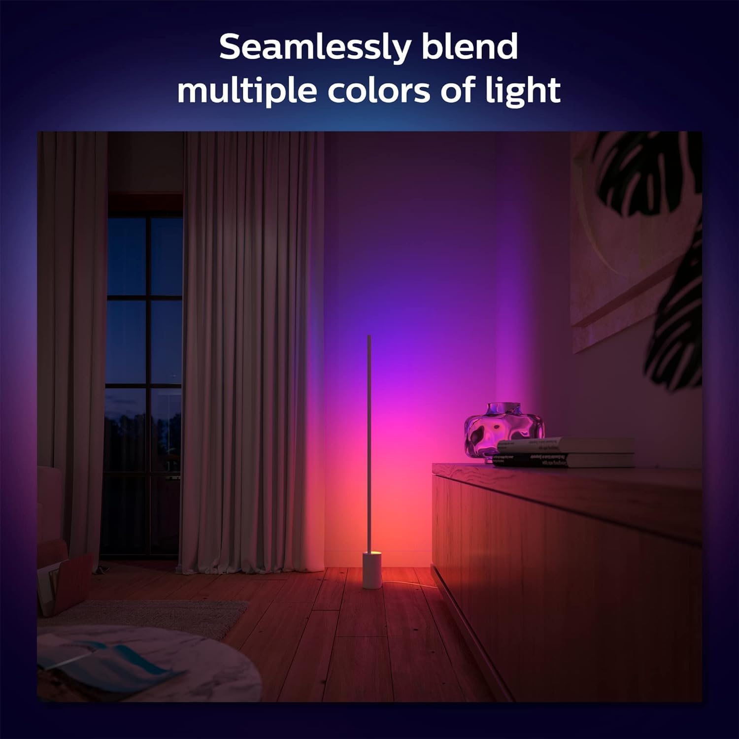 This Philips Hue White and color ambiance Signe gradient floor lamp offers flowing multicolor effects that blend seamlessly together to transform your home decor and the way you feel. This 29W smart RGB floor lamp features Bluetooth capability for instant light control in one room and offers up to 2550 lumens of brightness. Bluetooth makes it easy to get started with Philips Hue. Simply plug in the lamp download the Hue app and start enjoying the convenience of smart lighting immediately. Dim, brighten, and set the mood right out of the box. With Bluetooth you can control up to 10 lights in a single room. It’s easy to have the right light for routines throughout the day with Hue light scenes. Or create the ultimate mood lighting with dynamic light effects that show subtle changes in color or brightness that you can customize in the app. Looking for smart floor lamps that work with Alexa and Google Assistant? It’s easy to set up voice control with the Hue app and use simple voice commands to control your lights. Whether you need smart LED lamps for bedrooms, your living room, or even kids rooms, Hue complements your room decor while offering the convenience of smart control. Already have a Bridge or want to get more from your Hue system? Connect the Signe gradient floor lamp to a Hue Bridge (sold separately) to unlock the full power of Philips Hue, including the ability to control up to 50 lights and accessories, automations, and smart control from anywhere in the world.